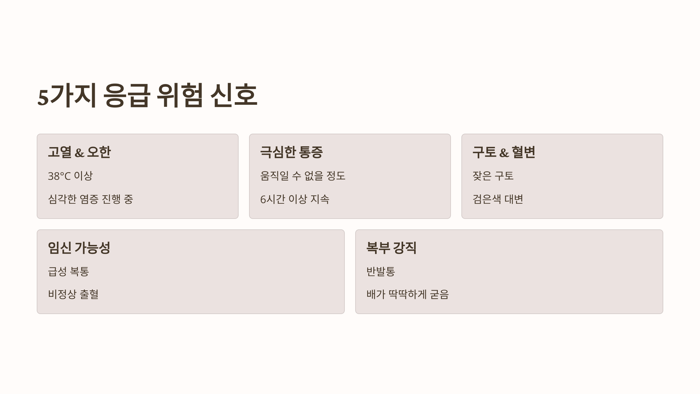 - 통증의 급격한 악화 및 지속: 통증이 갑자기 발생하여 움직일 수 없을 정도로 극심해지거나, 통증이 6시간 이상 지속될 경우 장기 파열이나 염전 등 응급 질환을 의심해야 합니다.
