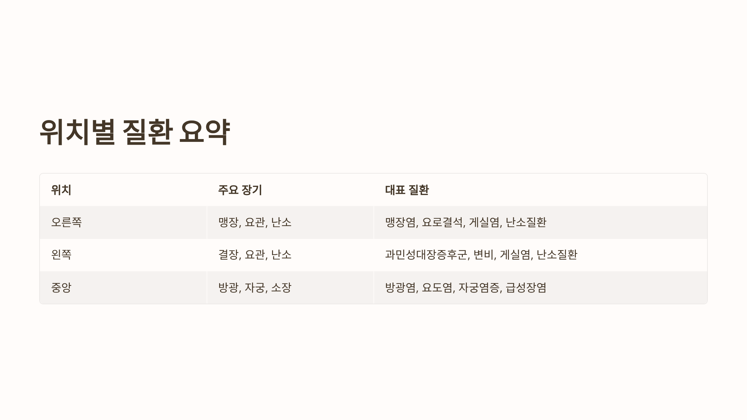 | 아랫배 중앙 | 방광, 자궁, 전립선, 소장 | 방광염, 요도염, 자궁 염증, 급성 장염 |