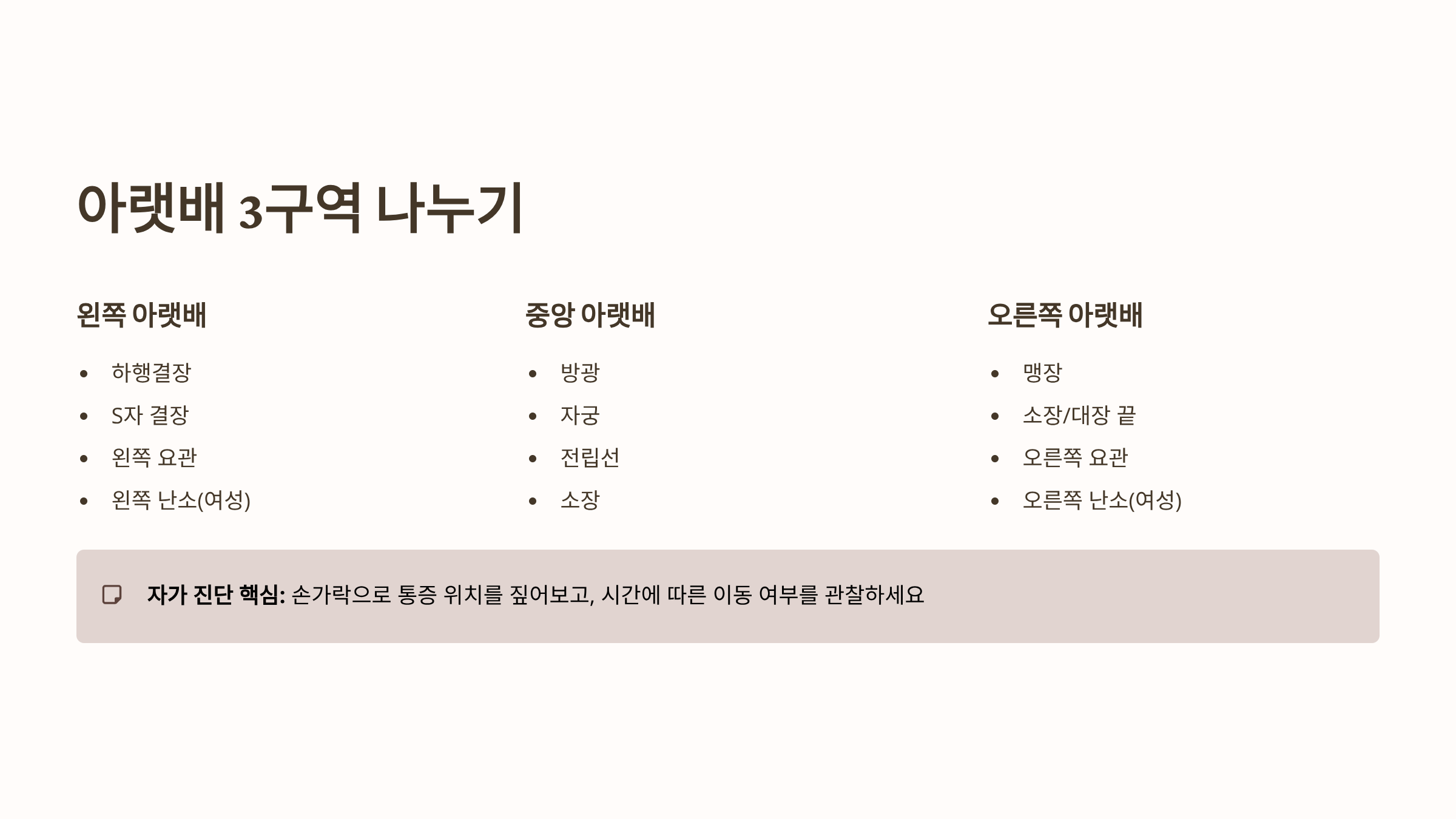 아랫배 통증을 진단할 때는 배꼽 아래를 세 구역(왼쪽, 오른쪽, 중앙)으로 나누어 어떤 장기가 그 위치에 있는지 확인하는 것이 기본입니다.