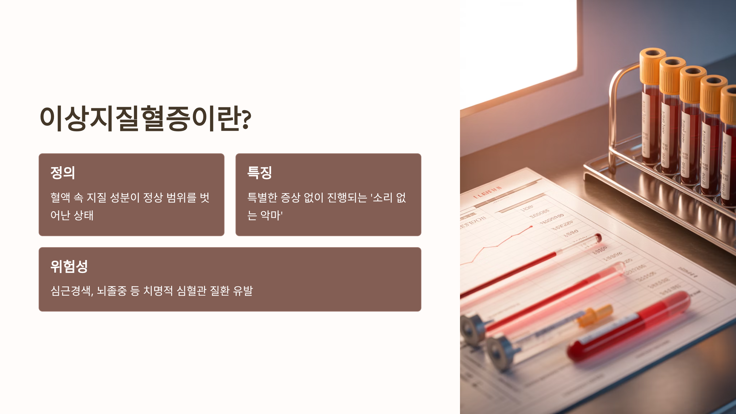이상지질혈증 이란 무엇일까요? 이 용어는 일반인에게 다소 생소하게 느껴질 수 있지만, 사실 현대인의 건강을 가장 은밀하고 치명적으로 위협하는 질환 중 하나입니다. 이상지질혈증은 특별한 증상 없이 진행되어 혈관을 서서히 망가뜨리므로 '소리 없는 죽음의 악마'라고 불립니다. 이 질환을 방치하면 심근경색, 뇌졸중 등 치명적인 심혈관 질환으로 이어질 수 있습니다.