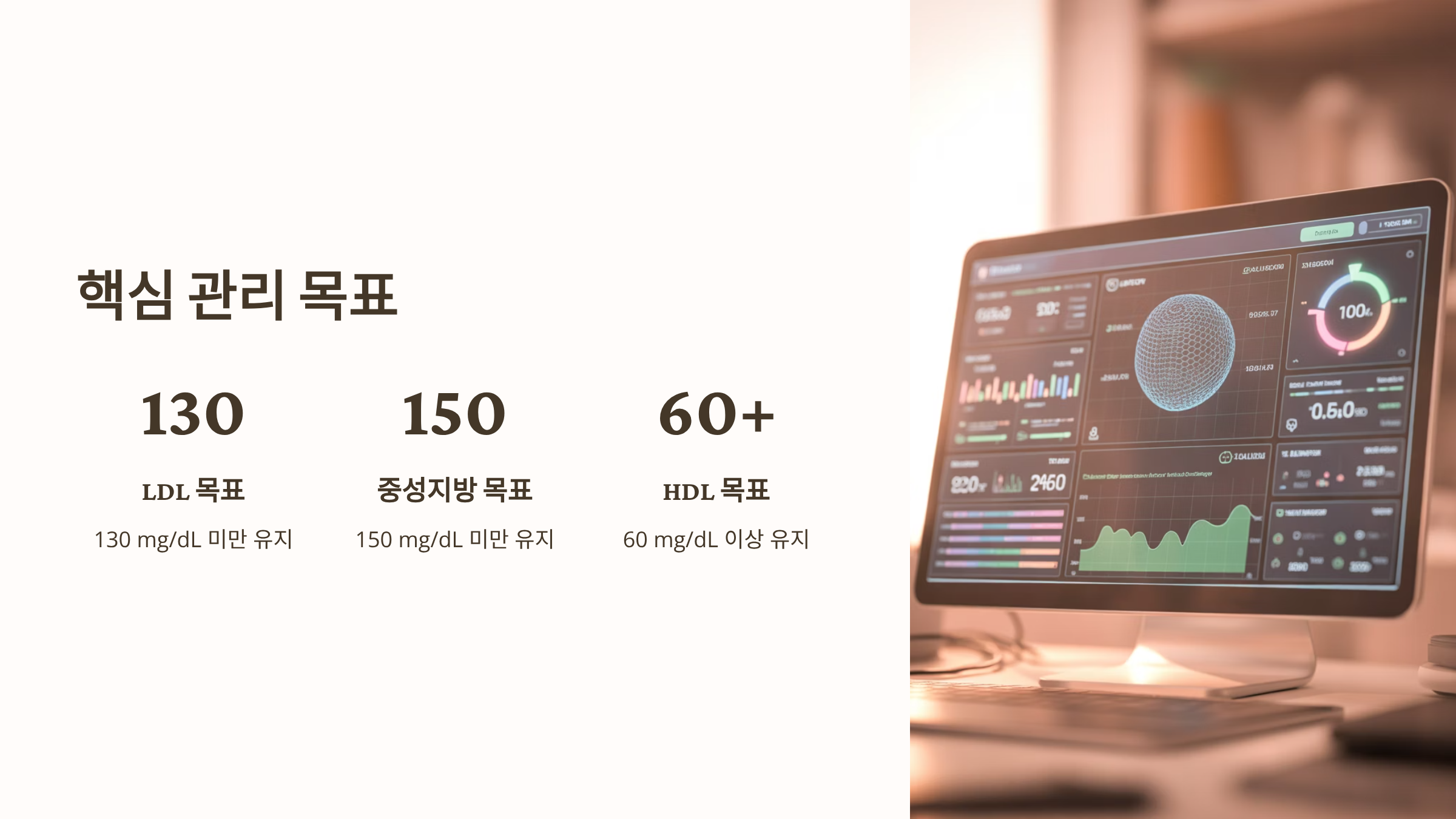 | LDL 콜레스테롤 (나쁜 것) | 130 미만 | 160 이상 | 높을수록 위험 (특히 190 이상은 매우 위험) |