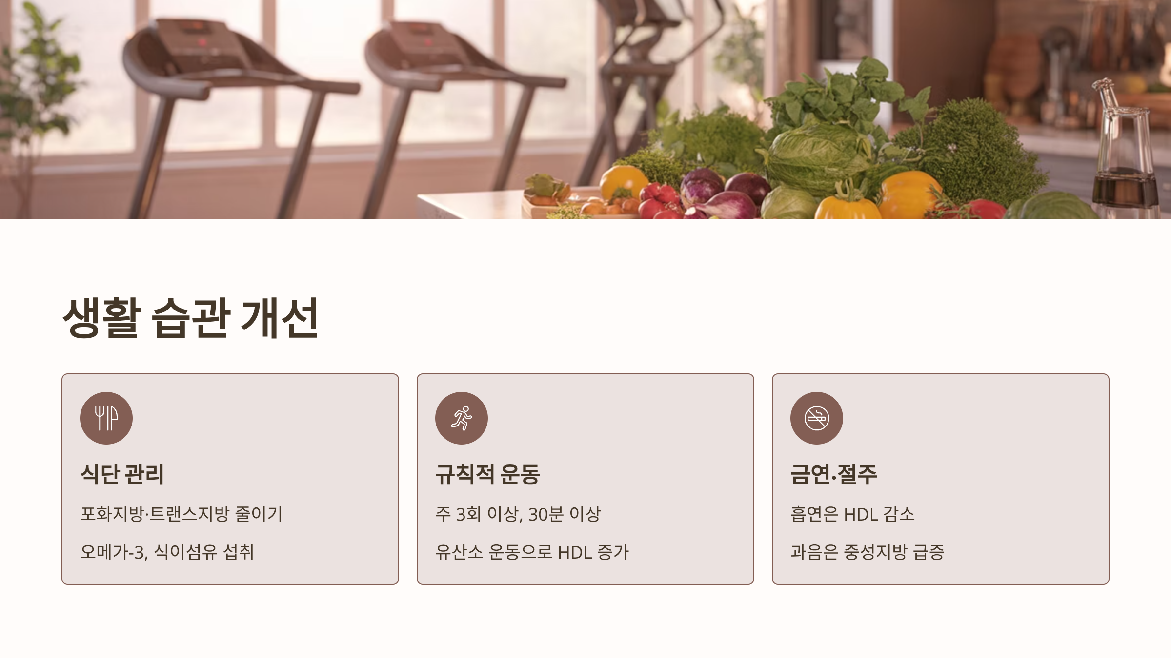 - 금연 및 절주: 흡연은 HDL 콜레스테롤 수치를 낮추고 동맥경화를 악화시키며, 과도한 음주는 중성지방 수치를 급격히 높이므로 반드시 금연 및 절주해야 합니다.