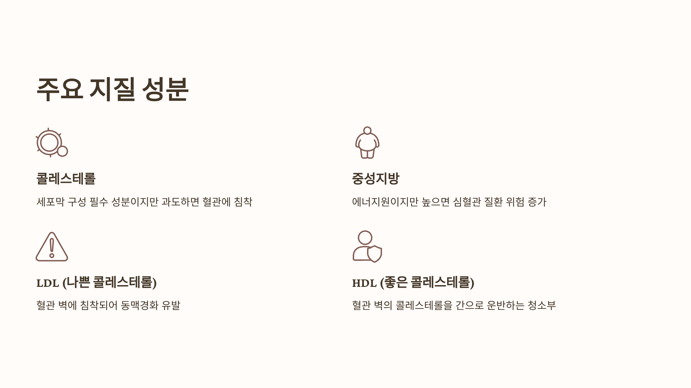 - 콜레스테롤: 세포막을 구성하는 필수 성분이지만, 과도할 경우 혈관에 침착됩니다.