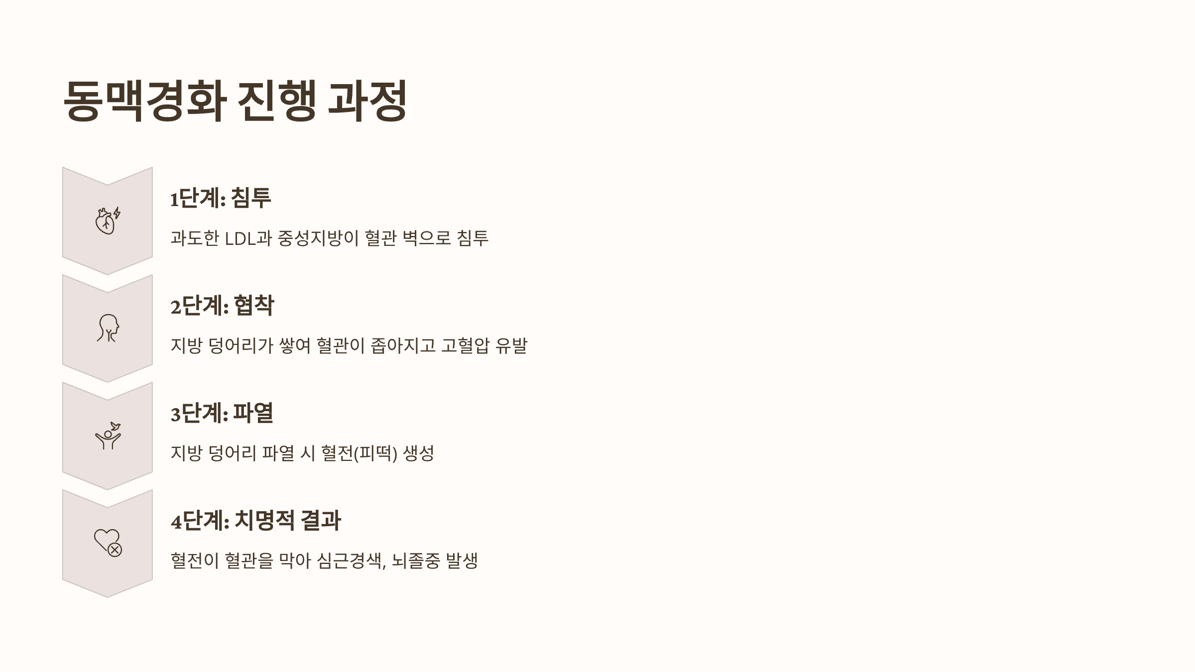 - 동맥경화 발생: 혈액 속의 과도한 LDL 콜레스테롤과 중성지방이 혈관 벽 안쪽으로 침투하여 쌓이기 시작합니다.