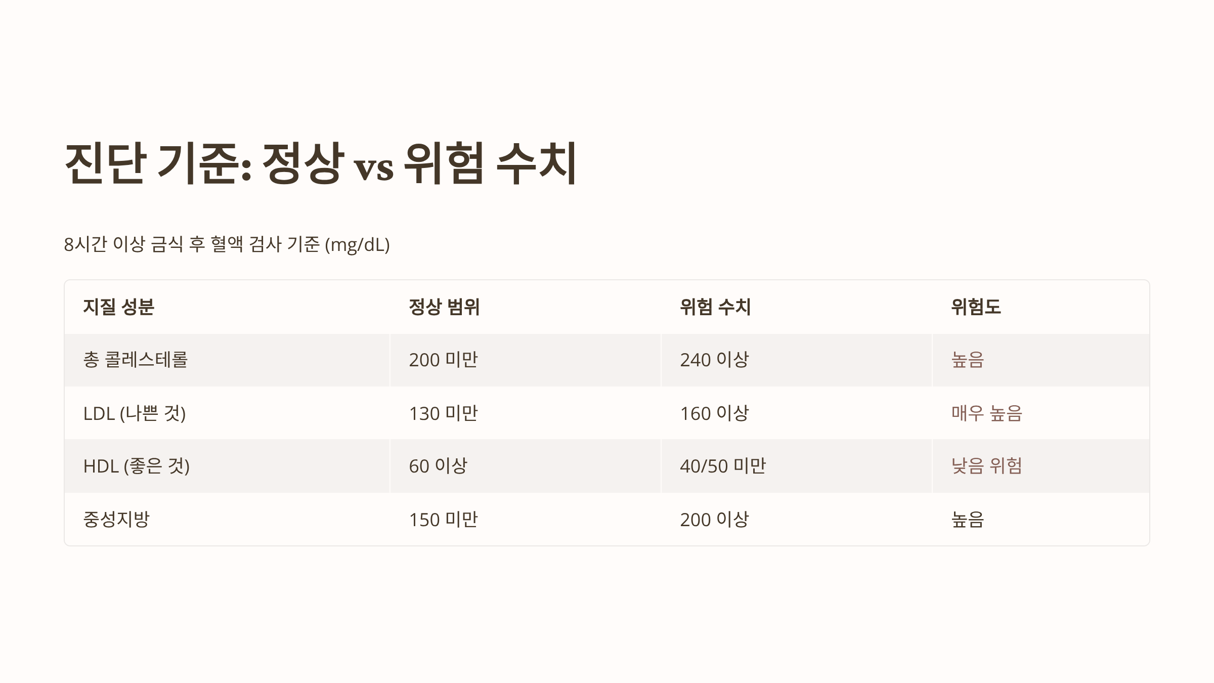 주요 진단 기준: 콜레스테롤, 중성지방 수치별 정상 범위와 위험 기준