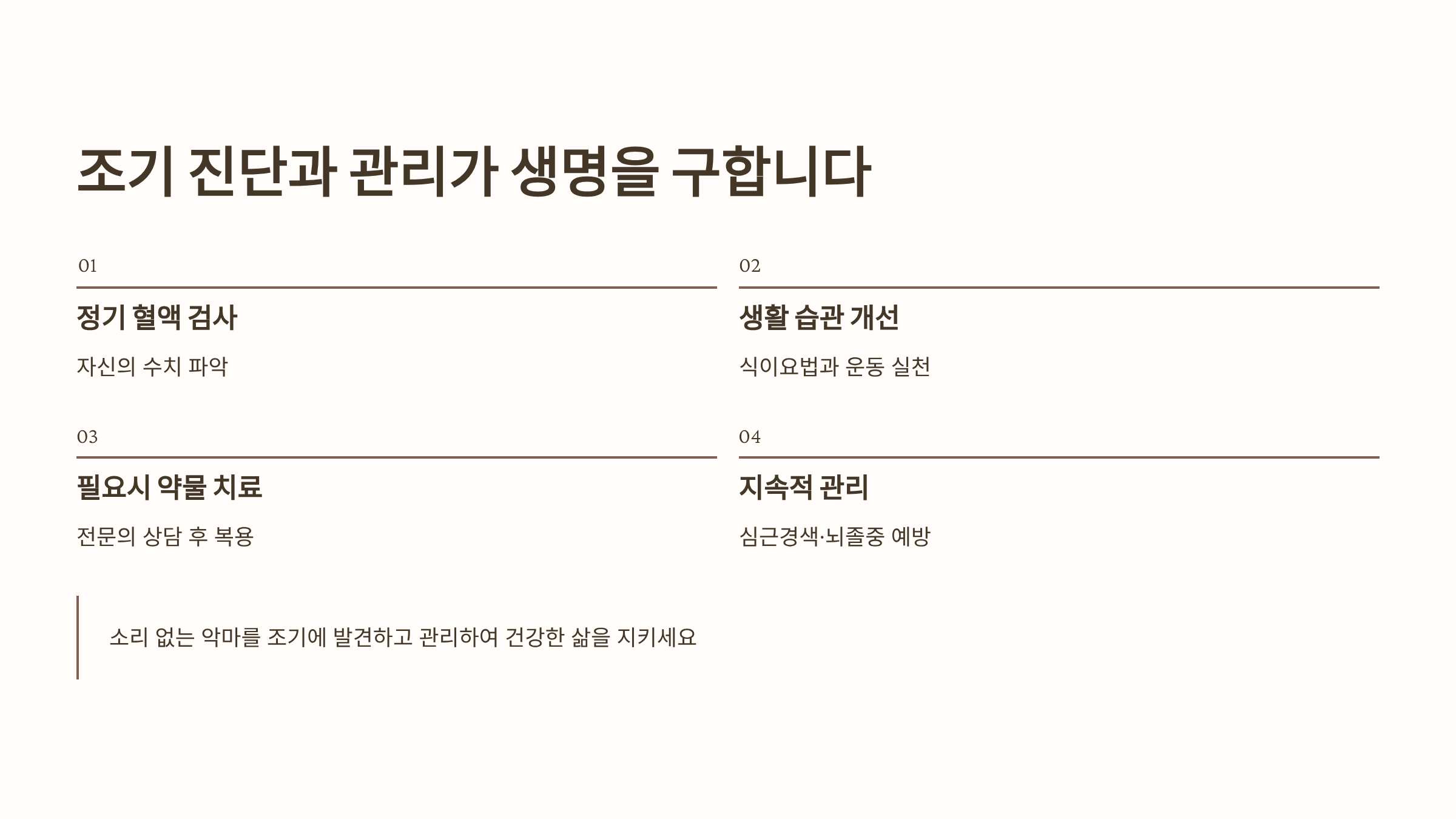 - 치명적인 결과: 이 혈전이 혈관을 완전히 막으면 심장에서는 심근경색, 뇌에서는 뇌졸중(뇌경색)이라는 치명적인 결과를 초래합니다. 이것이 이상지질혈증이 '소리 없는 죽음의 악마'로 불리는 이유입니다.
