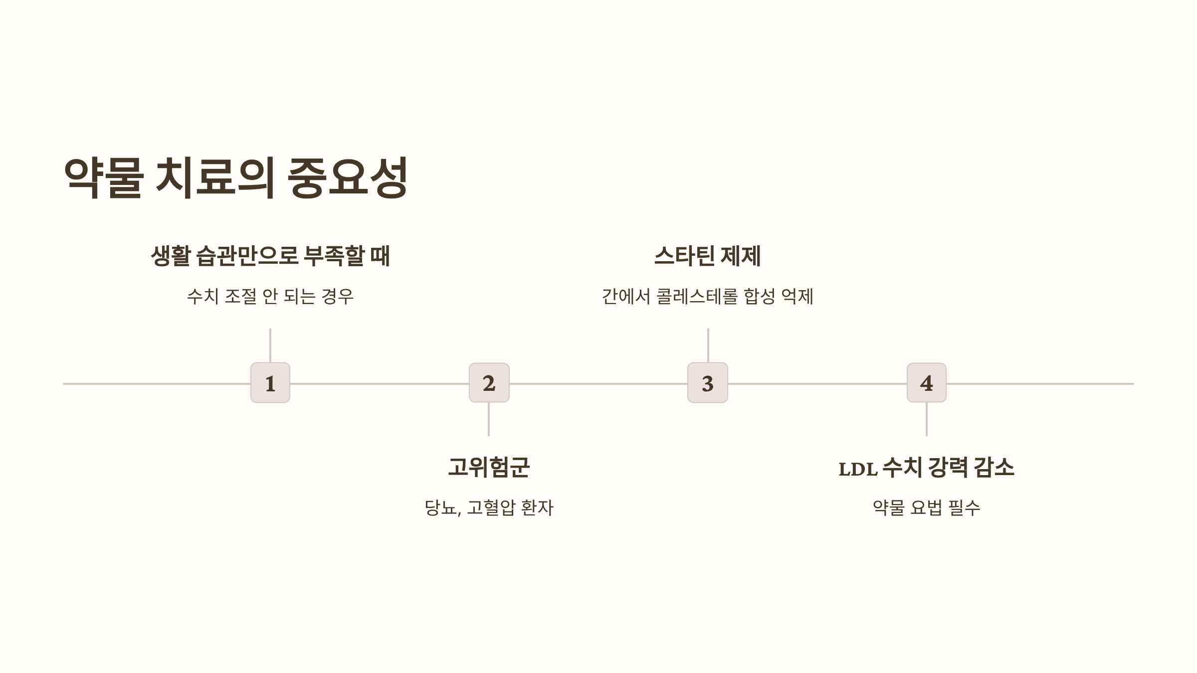 - 약물 요법 (스타틴 제제): 생활 습관 개선만으로 수치가 조절되지 않거나, 심혈관 질환 고위험군(당뇨, 고혈압 환자)의 경우 스타틴 제제 등의 약물 치료가 필수적입니다. 스타틴은 간에서 콜레스테롤 합성을 억제하여 LDL 수치를 강력하게 낮춥니다.