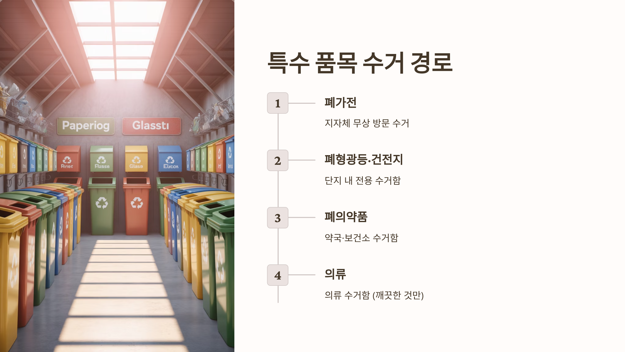 - 폐형광등 및 폐건전지: 일반 쓰레기와 분리하여 아파트 단지 내 또는 주민센터 등에 비치된 전용 수거함에 배출해야 합니다. 형광등의 수은과 건전지의 중금속은 환경 오염의 주범이므로 반드시 분리 배출해야 합니다.