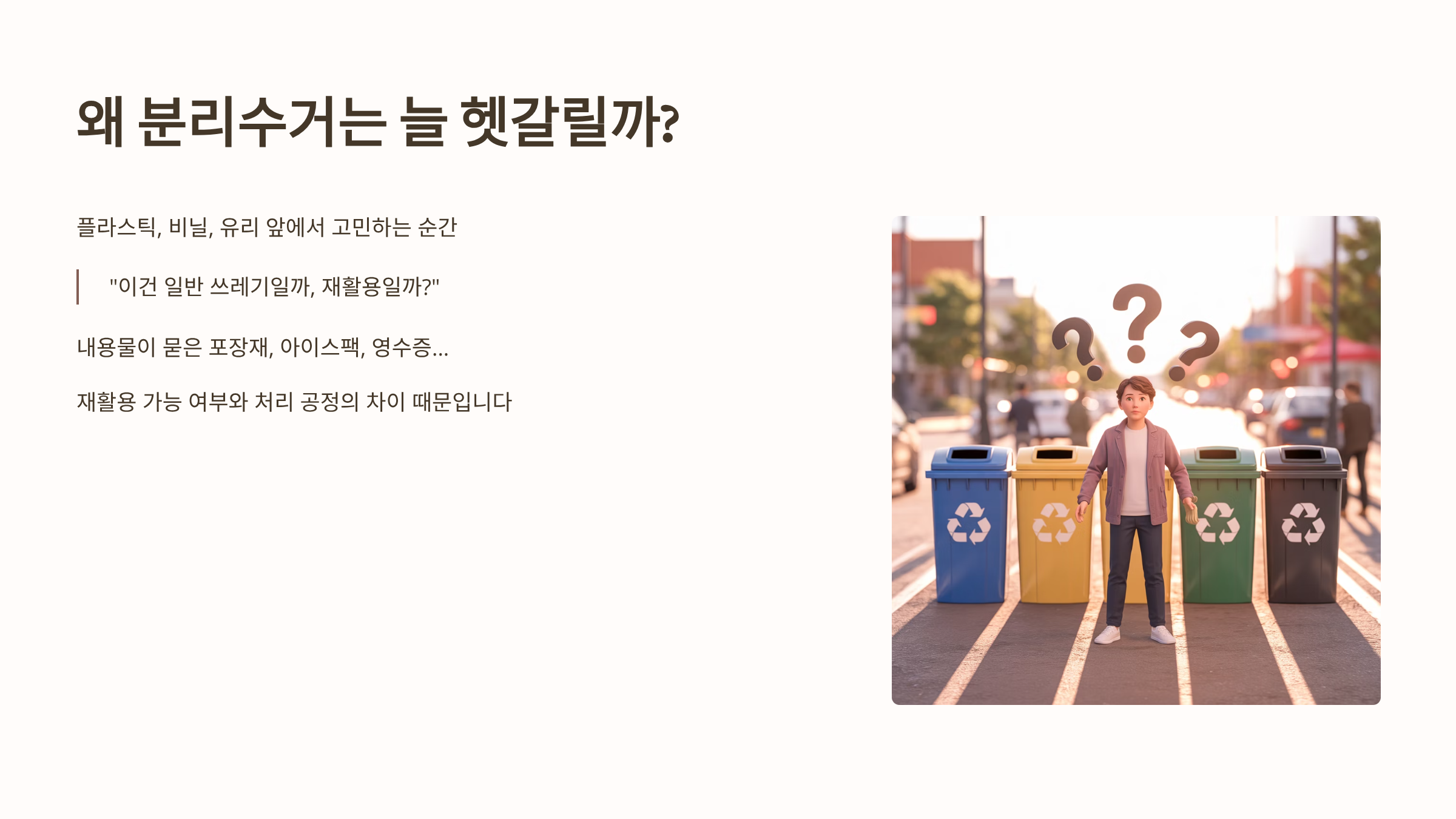 이 글은 재활용품 분리배출요령이 왜 늘 헷갈리는지 그 이유를 분석하고, 분리수거의 4대 핵심 원칙을 제시합니다.