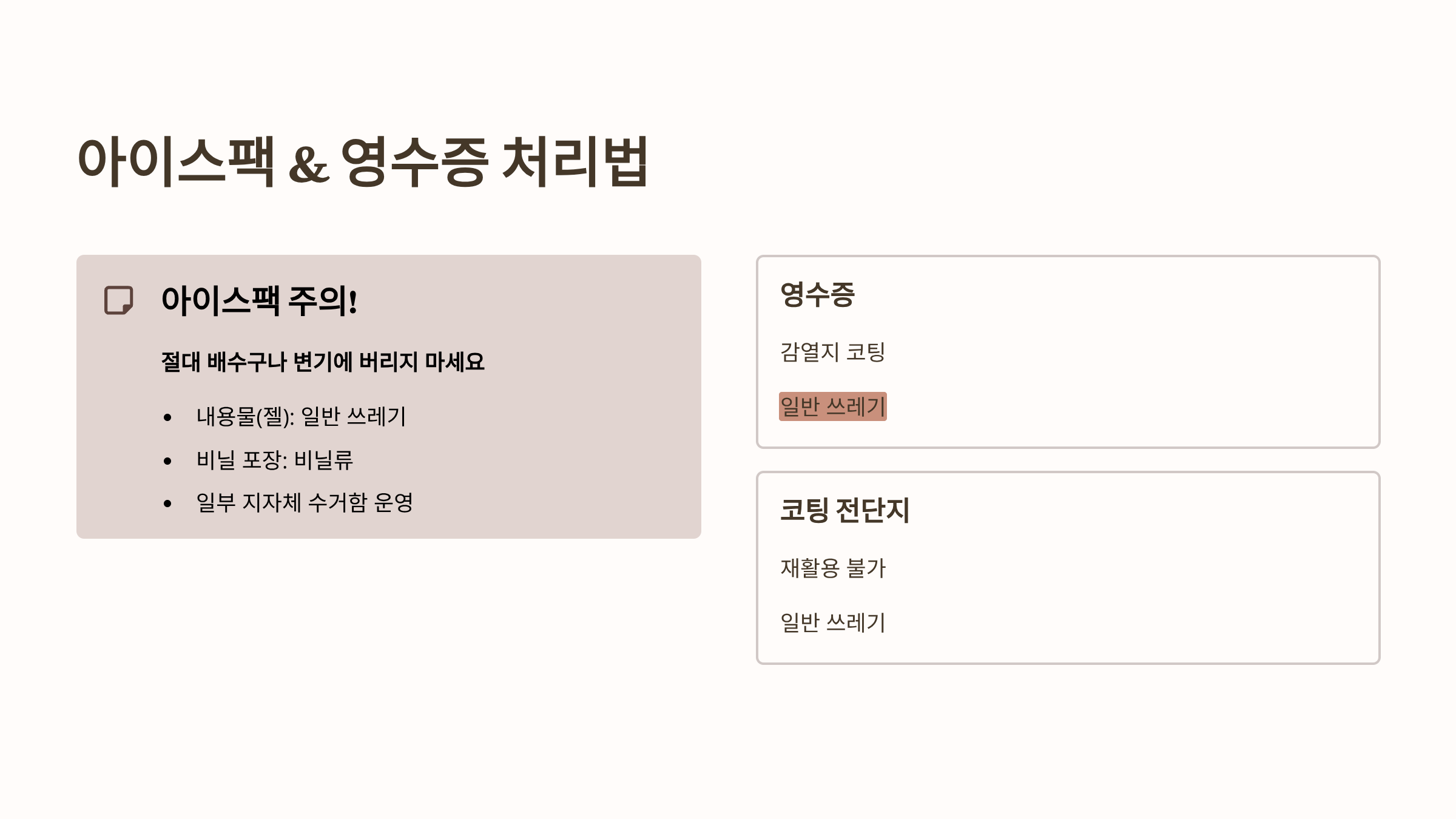 - 아이스팩: 내용물(젤 형태)은 고흡수성 수지라 재활용이 안 되므로 절대 배수구나 변기에 버리면 안 됩니다. 내용물은 일반 쓰레기 종량제 봉투에 버리고, 비닐 포장재만 비닐류에 배출합니다. (일부 지자체는 아이스팩 수거함 운영)