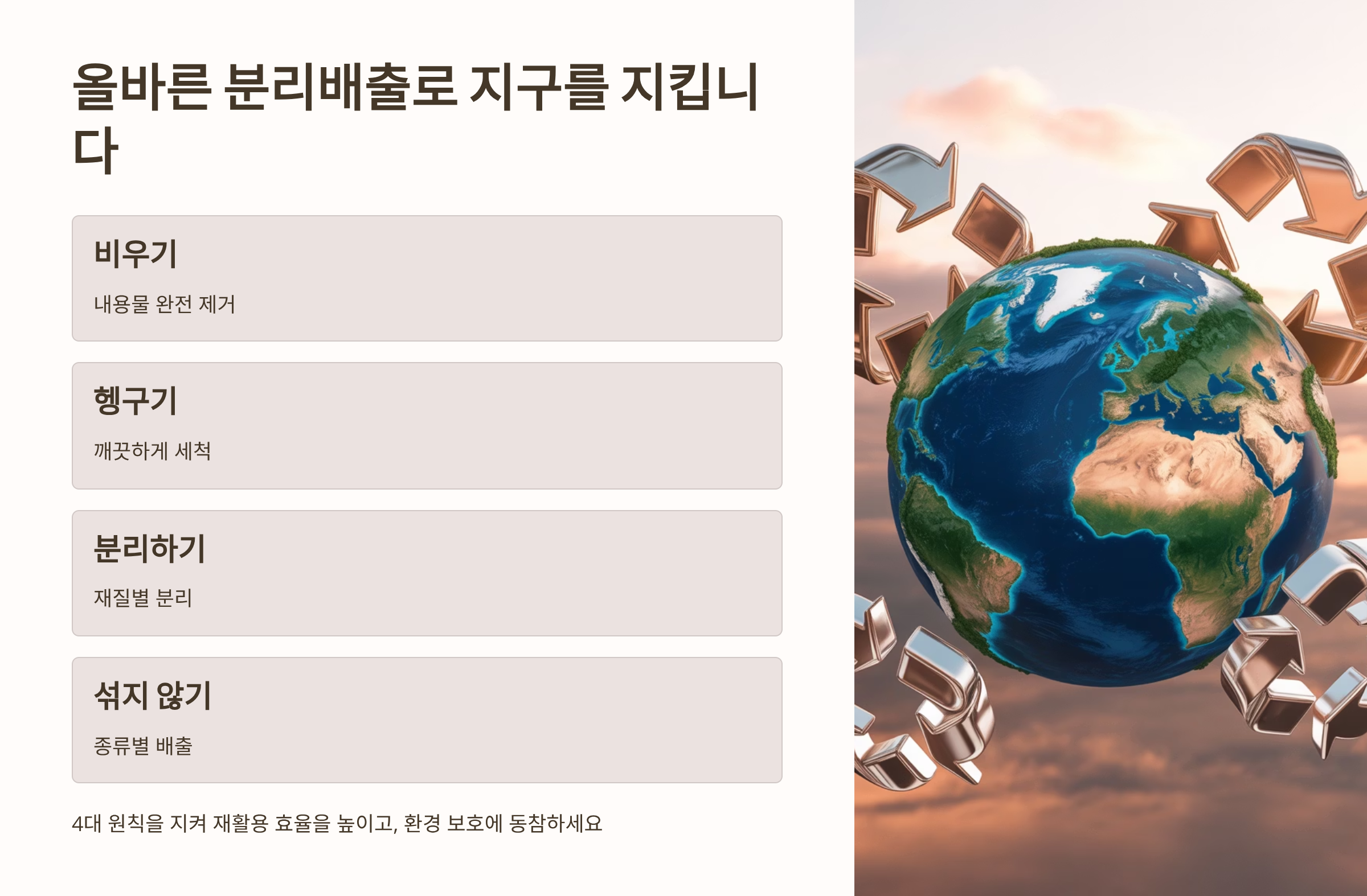 분리수거는 환경 보호의 첫걸음이자, 우리가 지켜야 할 중요한 생활 규범입니다.