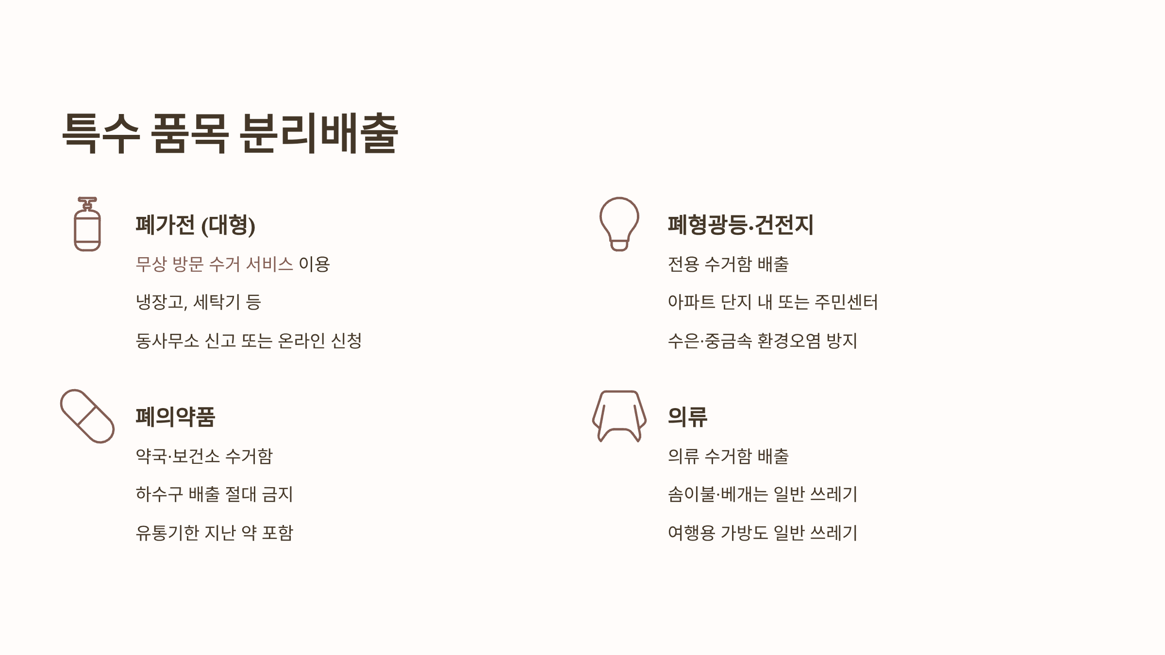 일반적인 재활용품 수거함이 아닌, 별도의 배출 경로를 따라야 하는 특수 품목들의 분리배출요령입니다.