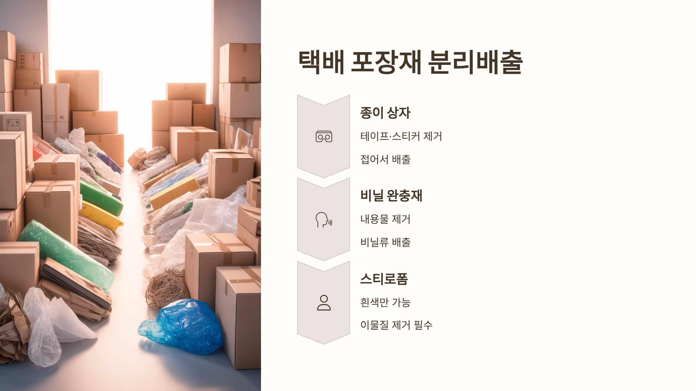 - 스티로폼 완충재: 테이프나 운송장을 제거하고 흰색 스티로폼만 배출합니다. 색상이 있거나 코팅된 스티로폼, 이물질이 묻은 스티로폼은 일반 쓰레기입니다.