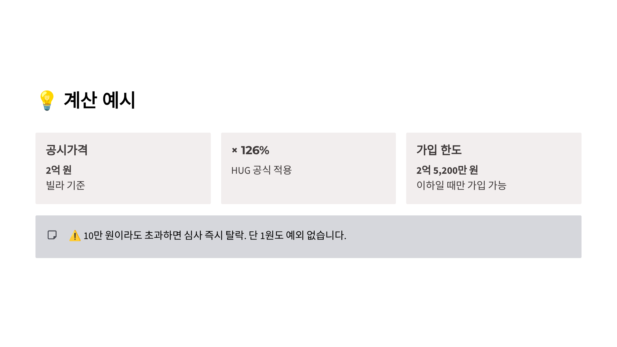 즉, 전세금이 2억 5천 2백만 원 이하일 때만 가입이 가능하며, 10만 원이라도 초과하면 심사에서 탈락합니다.