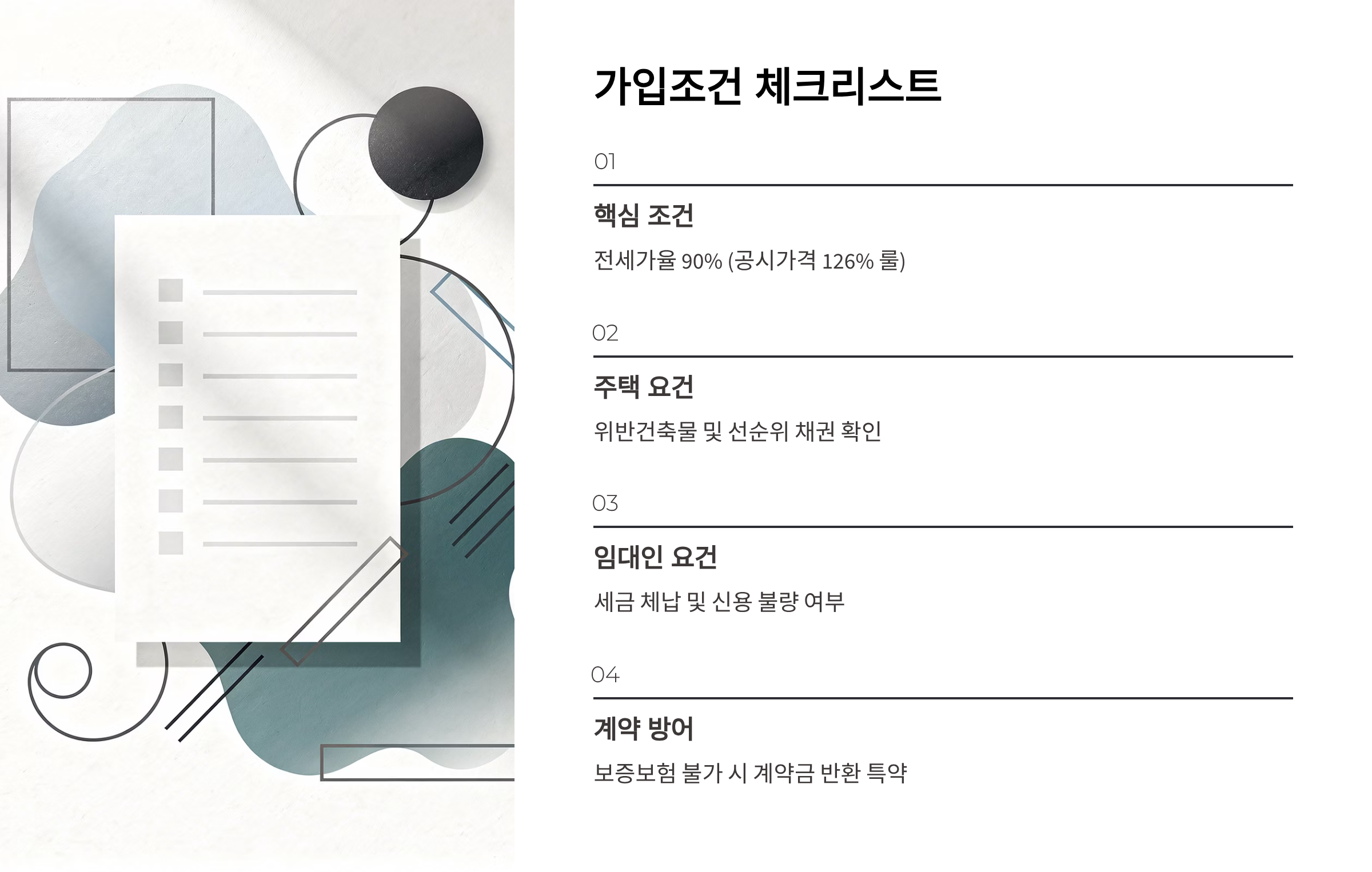 - 총 부채 한도: 선순위 채권(융자)과 내 전세보증금을 합친 금액이 주택가격의 100%를 초과하면 가입이 거절됩니다.