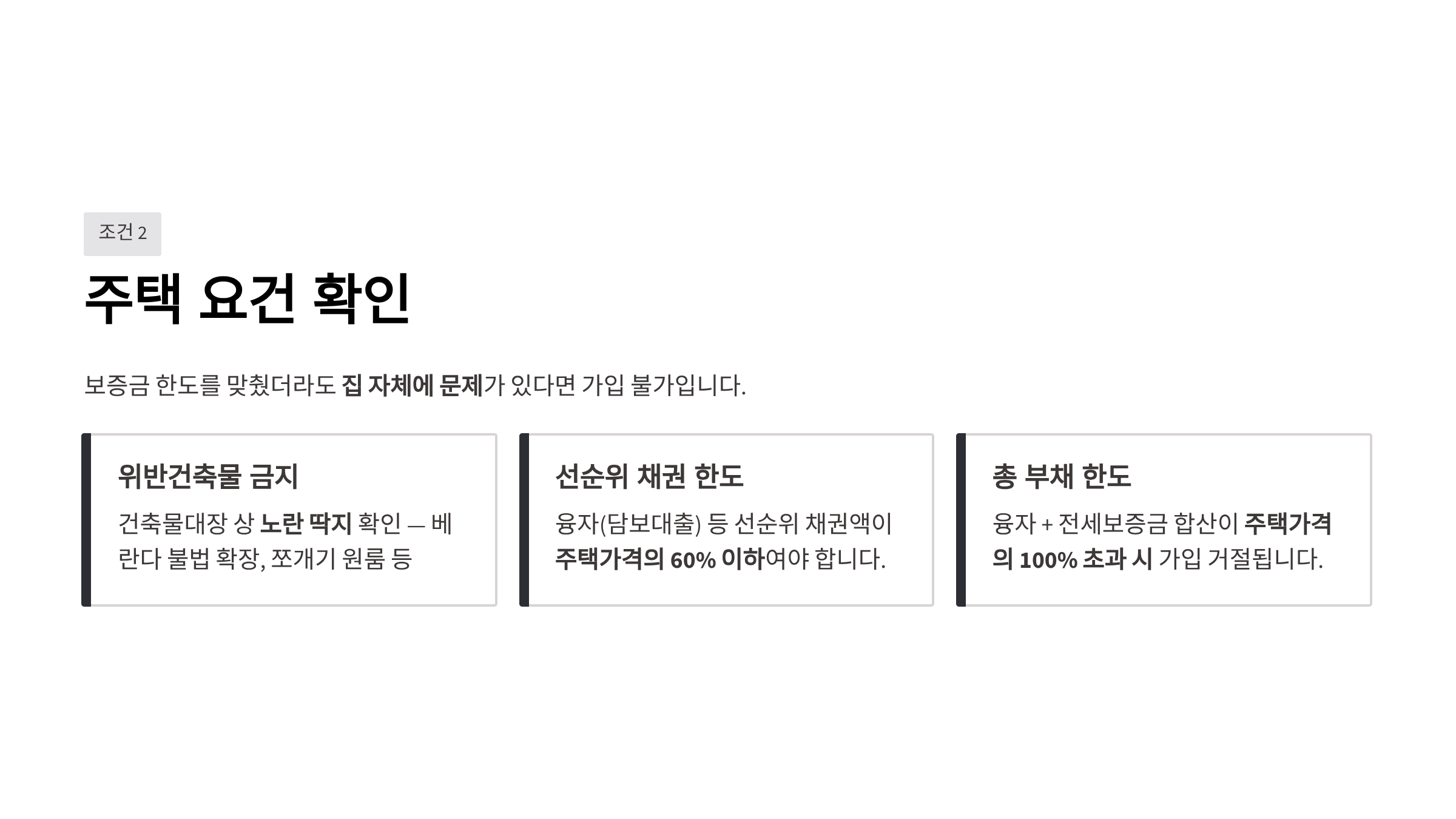 보증금 한도를 맞췄더라도 집 자체에 문제가 있다면 가입조건 미달입니다.