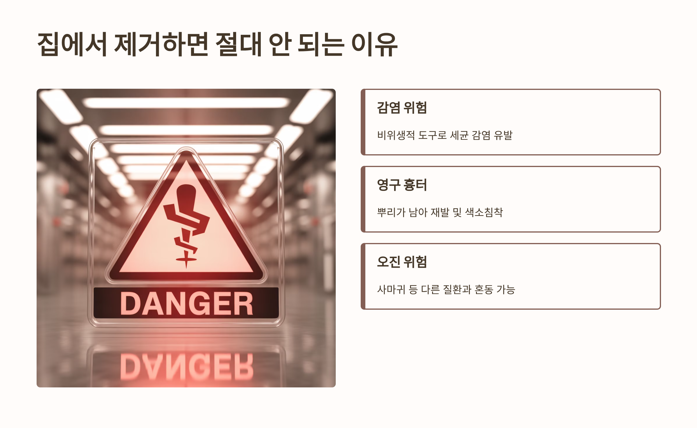 인터넷에 떠도는 '실 제거법', '손톱깎이 제거법' 등 자가 제거의 위험성을 명확히 인지해야 합니다. 의사들은 이러한 자가 제거를 강력히 경고합니다.