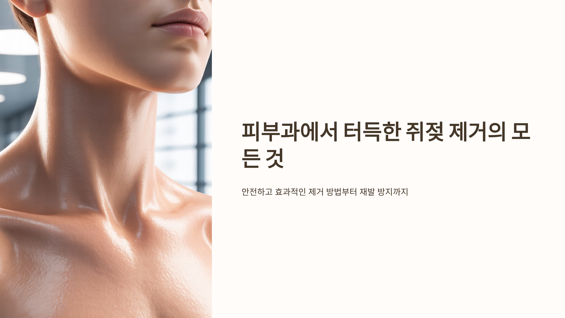 쥐젖(Skin Tag)은 목, 겨드랑이, 눈꺼풀 등 피부가 얇거나 접히는 부위에 흔히 발생하는 작은 양성 종양입니다. 건강에 해롭지는 않지만, 외관상 보기 좋지 않아 많은 사람들이 스트레스를 받으며 제거 방법을 찾습니다. 인터넷에는 자가 제거 팁들이 떠돌지만, 잘못된 방법으로 쥐젖을 뜯거나 잘라내면 감염과 흉터라는 더 큰 문제를 남길 수 있습니다. 쥐젖 제거방법을 검색했다면, 안전을 최우선으로 하여 피부과에서 검증된 확실한 방법과 시술 후 관리에 대한 구체적인 정보를 얻고 싶기 때문일 것입니다. 이 글은 쥐젖 제거에 대한 모든 궁금증을 해소하고, 피부과 시술 정보를 바탕으로 흉터 없이 깨끗하게 쥐젖을 제거하는 방법을 안내하겠습니다.