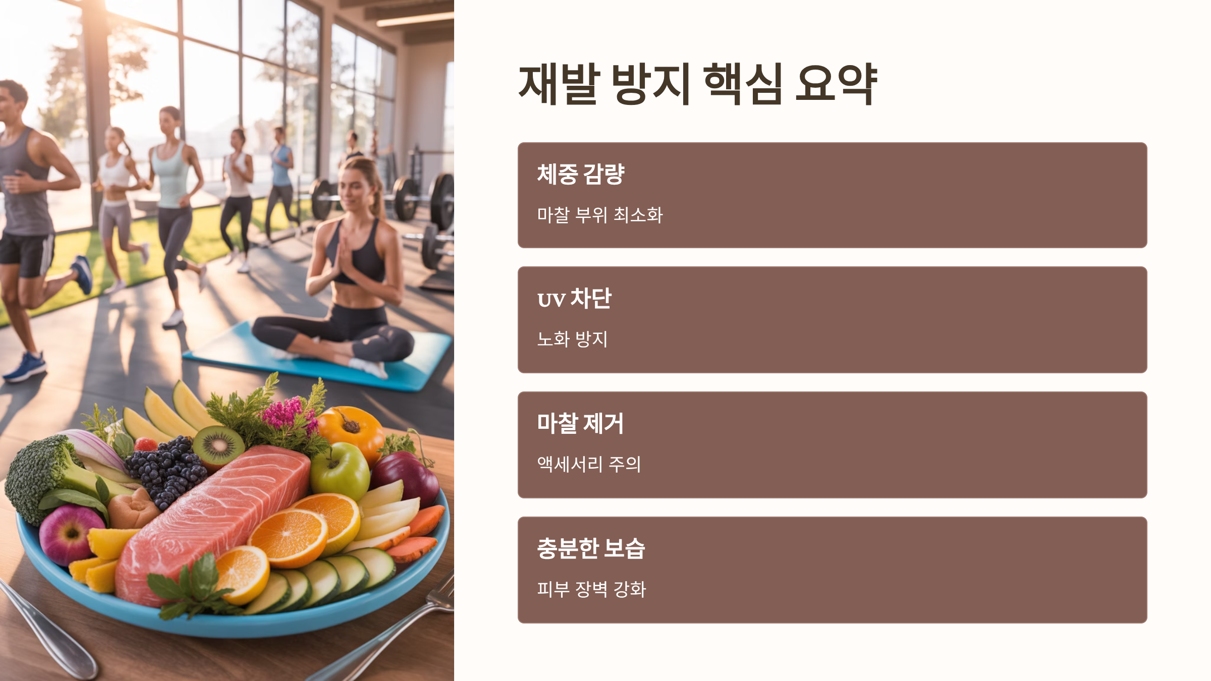 - 체중 및 비만 관리: 비만으로 인해 피부가 접히는 부위(겨드랑이, 목)의 마찰이 증가하면 쥐젖 발생 위험이 높아집니다. 체중을 관리하여 피부 마찰을 줄이는 것이 가장 근본적인 재발 방지책입니다.