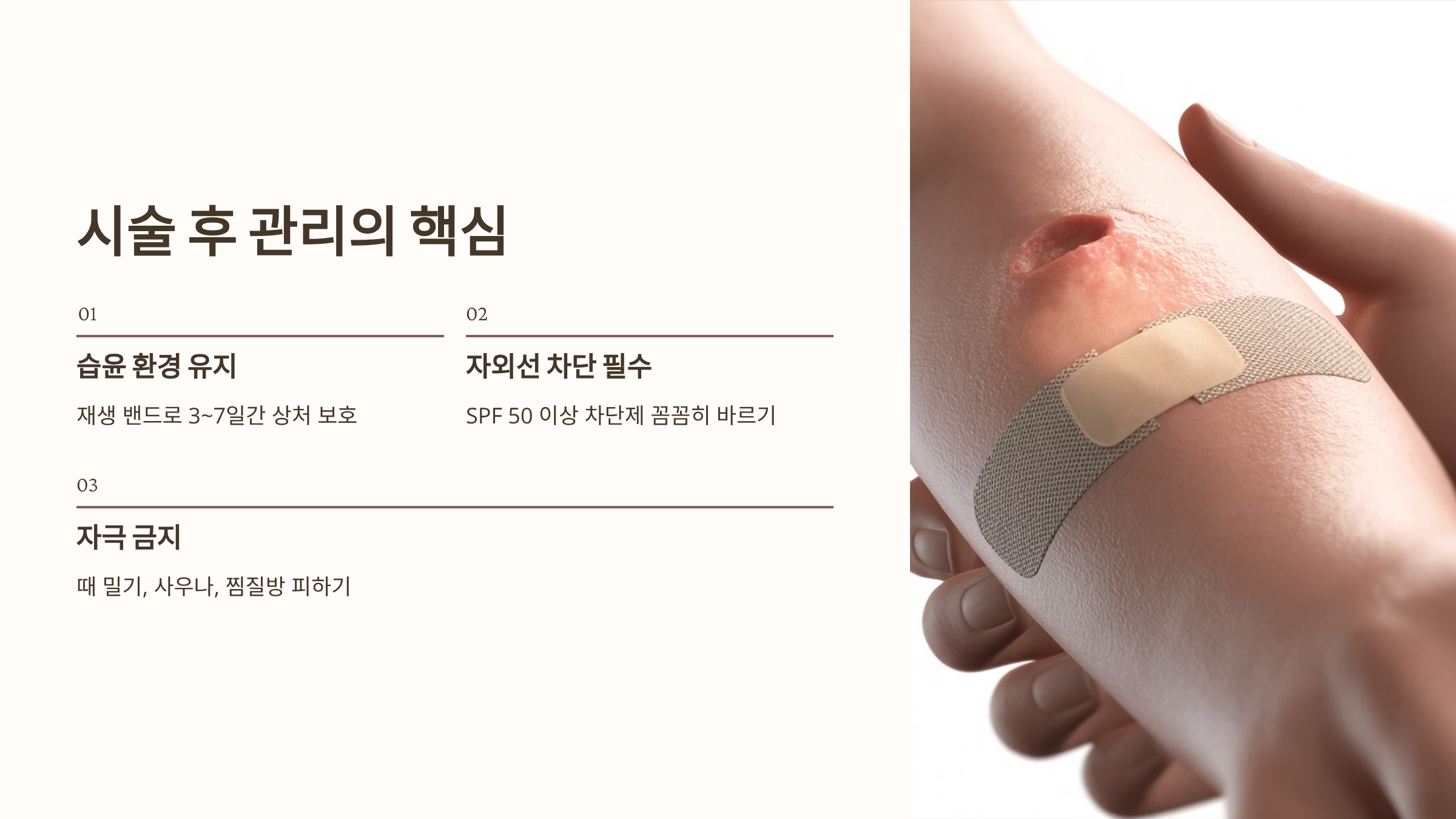 - 습윤 환경 유지 (최우선): 시술 부위에는 작은 상처가 생깁니다. 상처 부위를 마르지 않게 습윤 밴드(재생 밴드)를 붙여 진물 흡수와 외부 세균 감염을 막고 피부 재생을 유도해야 합니다. 밴드는 상처가 아물 때까지 3~7일간 유지합니다.
