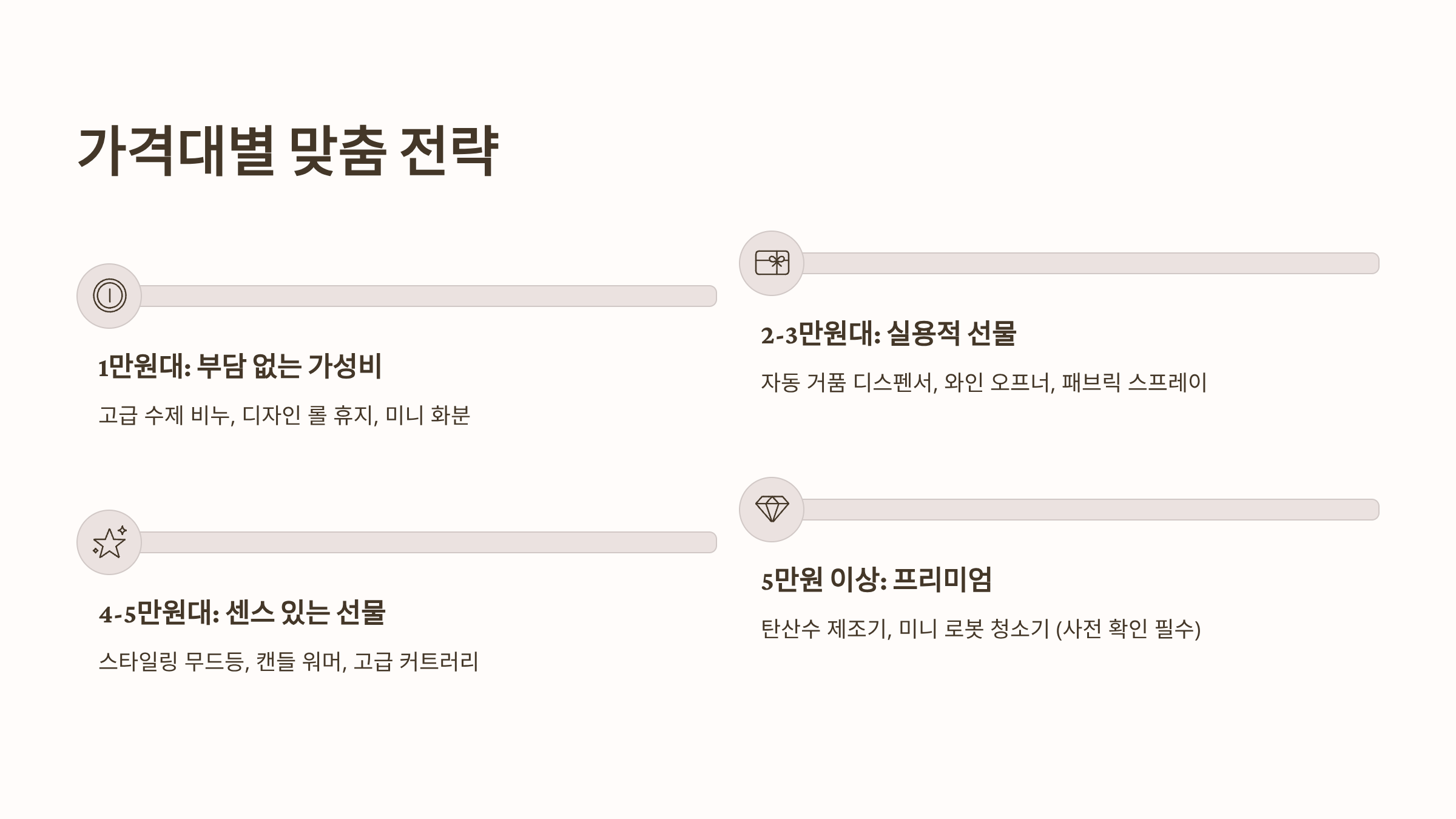 - 4만원 ~ 5만원대 (센스 있는 선물): 친한 친구나 가까운 가족에게 적합한 가격대입니다. 스타일링 무드등, 캔들 워머, 품질 좋은 커피 메이커(간이용), 고급 커트러리 세트 등 인테리어 오브제와 실용성을 겸비한 제품이 환영받습니다.
