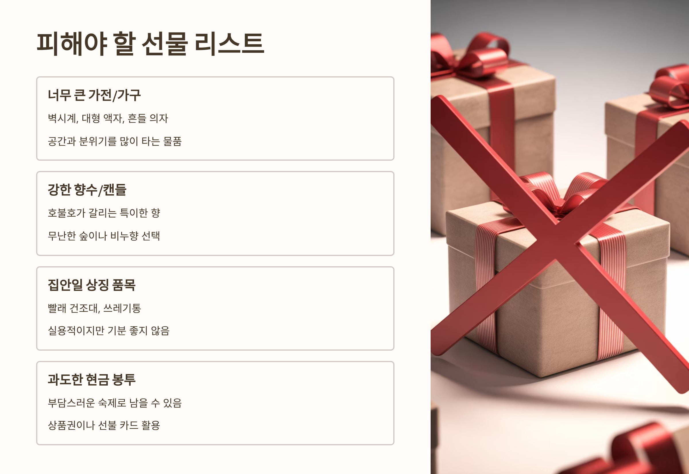 호스트에게 부담을 주거나, 이미 가지고 있을 확률이 높아 처치 곤란한 '선물 금지' 품목들입니다.