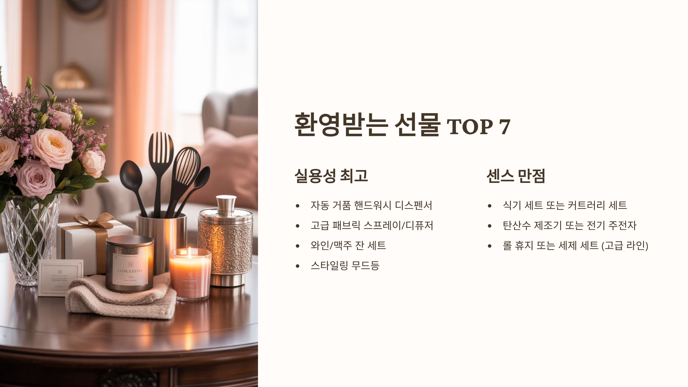 집들이 초대를 받는 것은 새 출발을 하는 지인에게 축하와 응원을 전할 수 있는 기회입니다. 하지만 막상 선물을 고르려면 '이 선물이 정말 실용적일까?', '호스트가 이미 가지고 있지는 않을까?' 하는 고민에 빠지기 쉽습니다. 당신이 지금 '집들이 선물 베스트'를 검색한 것은, 받는 사람이 진심으로 환영하고 오래도록 잘 사용할 수 있는 센스 있고 실용적인 선물을 찾고 싶기 때문일 것입니다. 이 글은 받는 사람과 주는 사람 모두 만족할 수 있는 집들이 선물 베스트 TOP 7 리스트를 공개하고, 예산에 맞춰 가장 효과적인 선물을 고르는 전략과 함께 선물의 의미를 더하는 노하우를 상세히 안내하겠습니다.