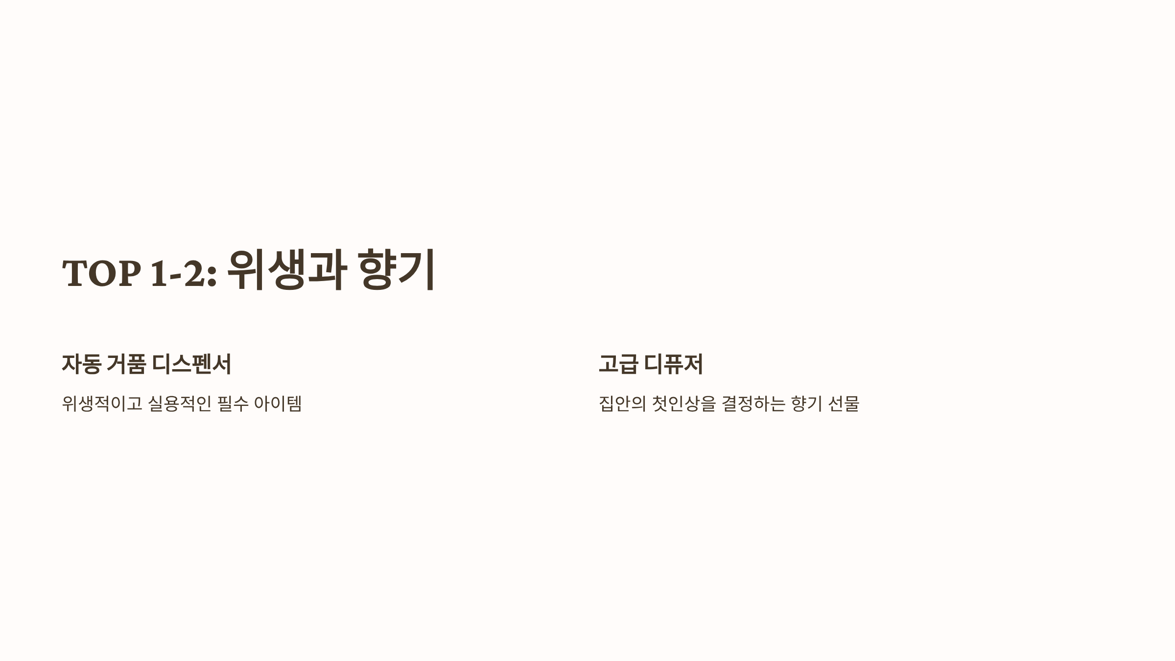 - 고급 패브릭 스프레이/디퓨저: (인테리어/실용성 중상) 집안의 첫인상을 결정하는 '향기'를 선물하는 것으로, 무난하고 심플한 디자인의 제품을 선택하면 인테리어 오브제로도 손색이 없습니다.