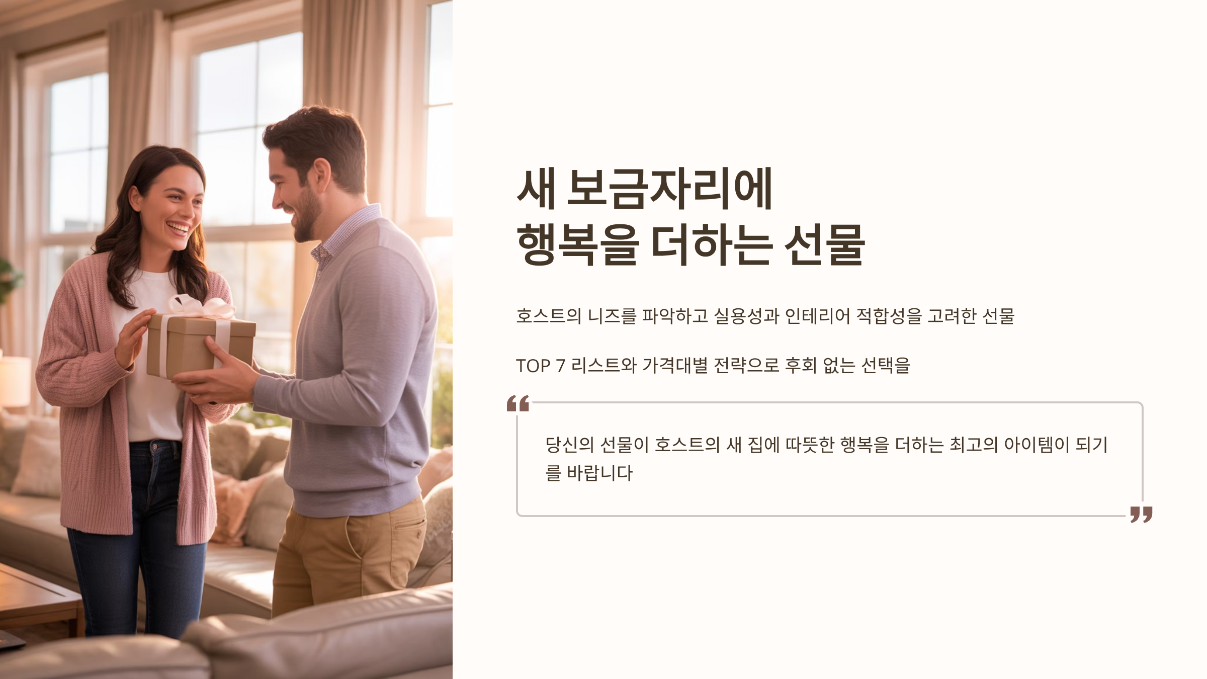 1~3만원대 가성비 전략과 5만원 이상 프리미엄 전략을 예산에 맞춰 활용하되, 너무 크거나 호불호가 갈리는 선물은 피해야 합니다. 이 글에서 제시된 선물 후회 방지 기준과 센스 있는 전달 팁을 통해, 당신의 선물이 호스트의 새 보금자리에 따뜻한 행복을 더하는 최고의 아이템이 되기를 바랍니다.
