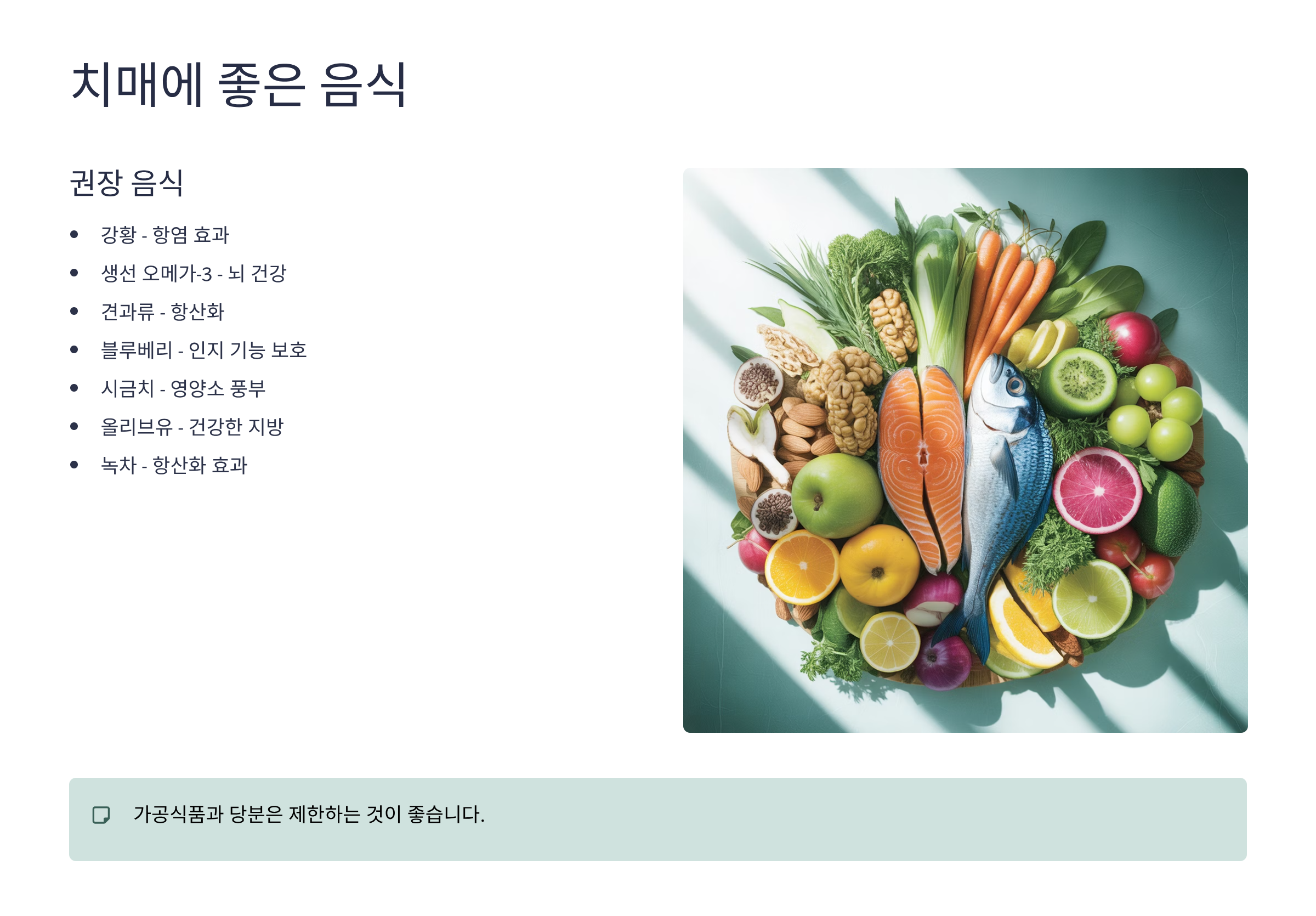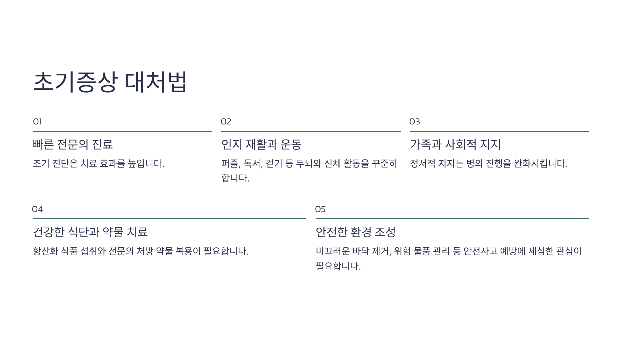 항산화 및 뇌 기능 개선 식품 섭취와 전문의 처방 약물 복용이 필요합니다. - 안전한 환경 조성