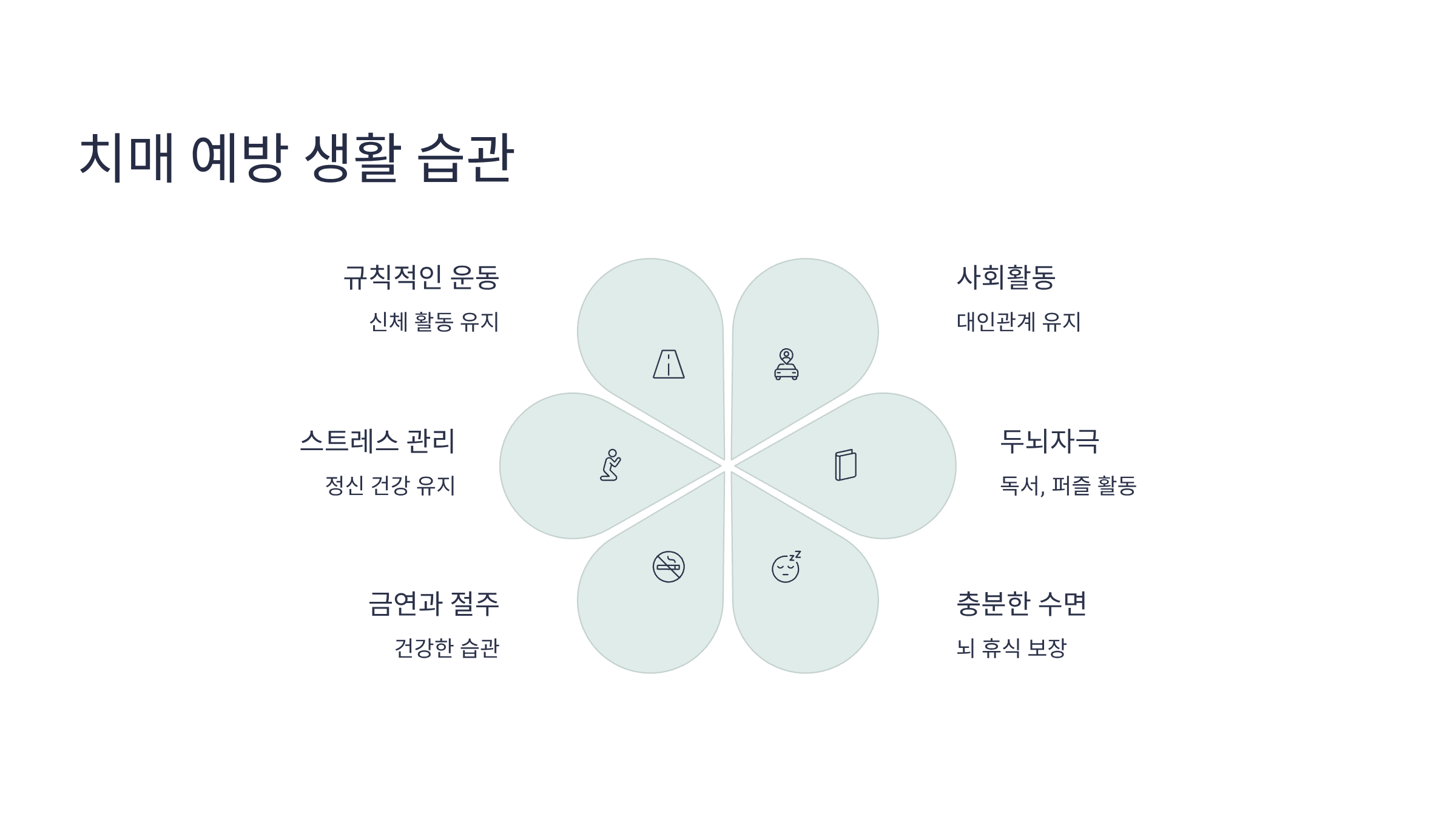 규칙적인 운동과 사회활동, 두뇌자극 활동(독서, 퍼즐), 충분한 수면, 금연과 절주, 스트레스 관리가 치매 예방에 매우 중요합니다.