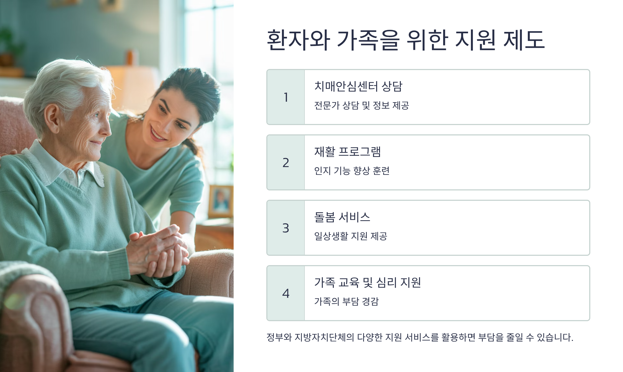정부와 지방자치단체는 치매 환자 및 가족을 위한 다양한 지원 서비스를 제공합니다. 치매안심센터 상담, 재활 프로그램, 돌봄 서비스, 가족 교육 및 심리 지원 프로그램 등 유용한 제도를 활용하면 부담을 줄일 수 있습니다.