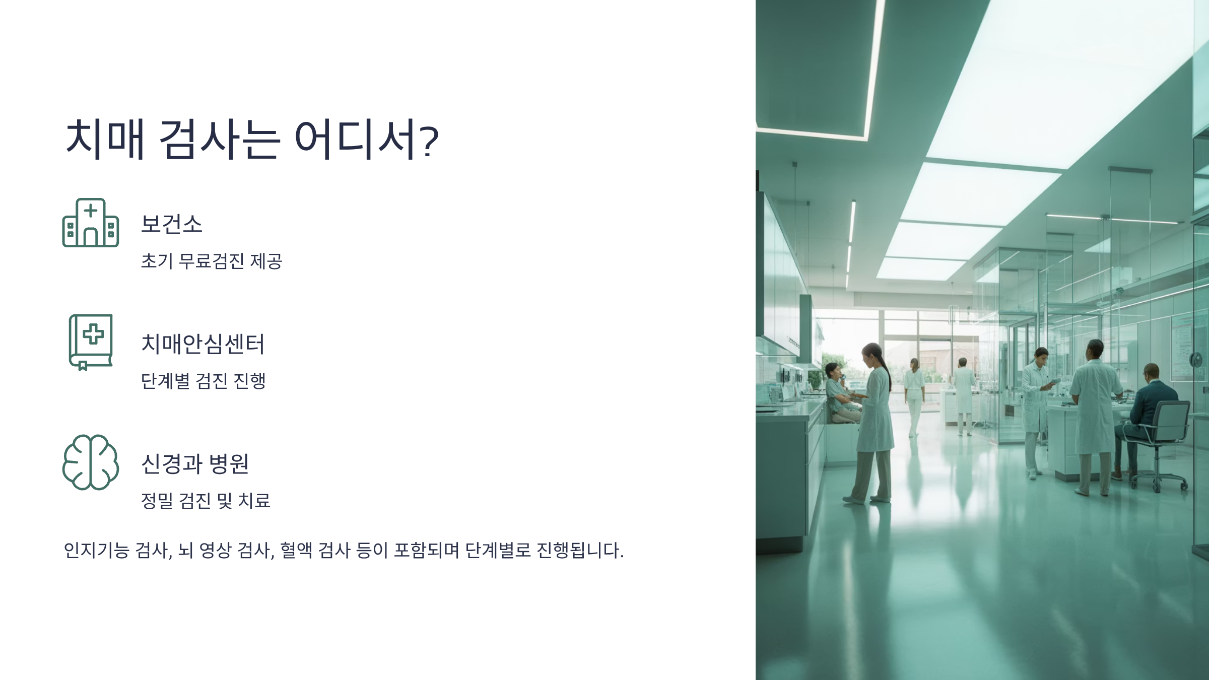 치매 검사는 가까운 보건소, 치매안심센터, 신경과 병원에서 받을 수 있습니다. 인지기능 검사, 뇌 영상 검사, 혈액 검사 등이 포함되며, 초기 무료검진부터 정밀 검진까지 단계별로 진행됩니다.