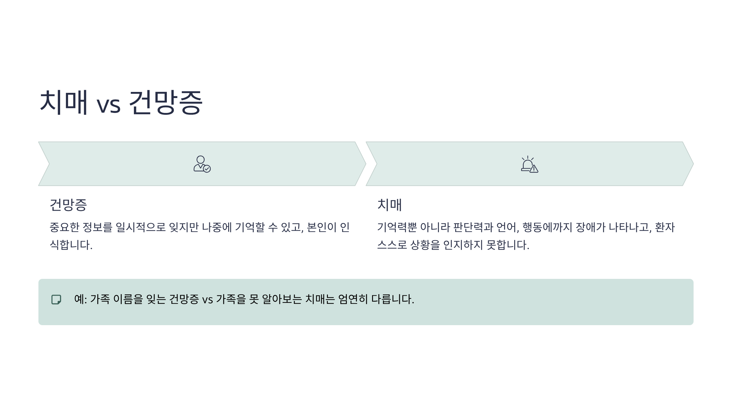 단순한 건망증과 치매는 구분이 중요합니다. 건망증은 중요한 정보를 일시적으로 잊지만 나중에 기억할 수 있고, 본인이 인식합니다. 반면 치매는 기억력뿐 아니라 판단력과 언어, 행동에까지 장애가 나타나고, 환자 스스로 상황을 인지하지 못하는 경우가 대부분입니다.