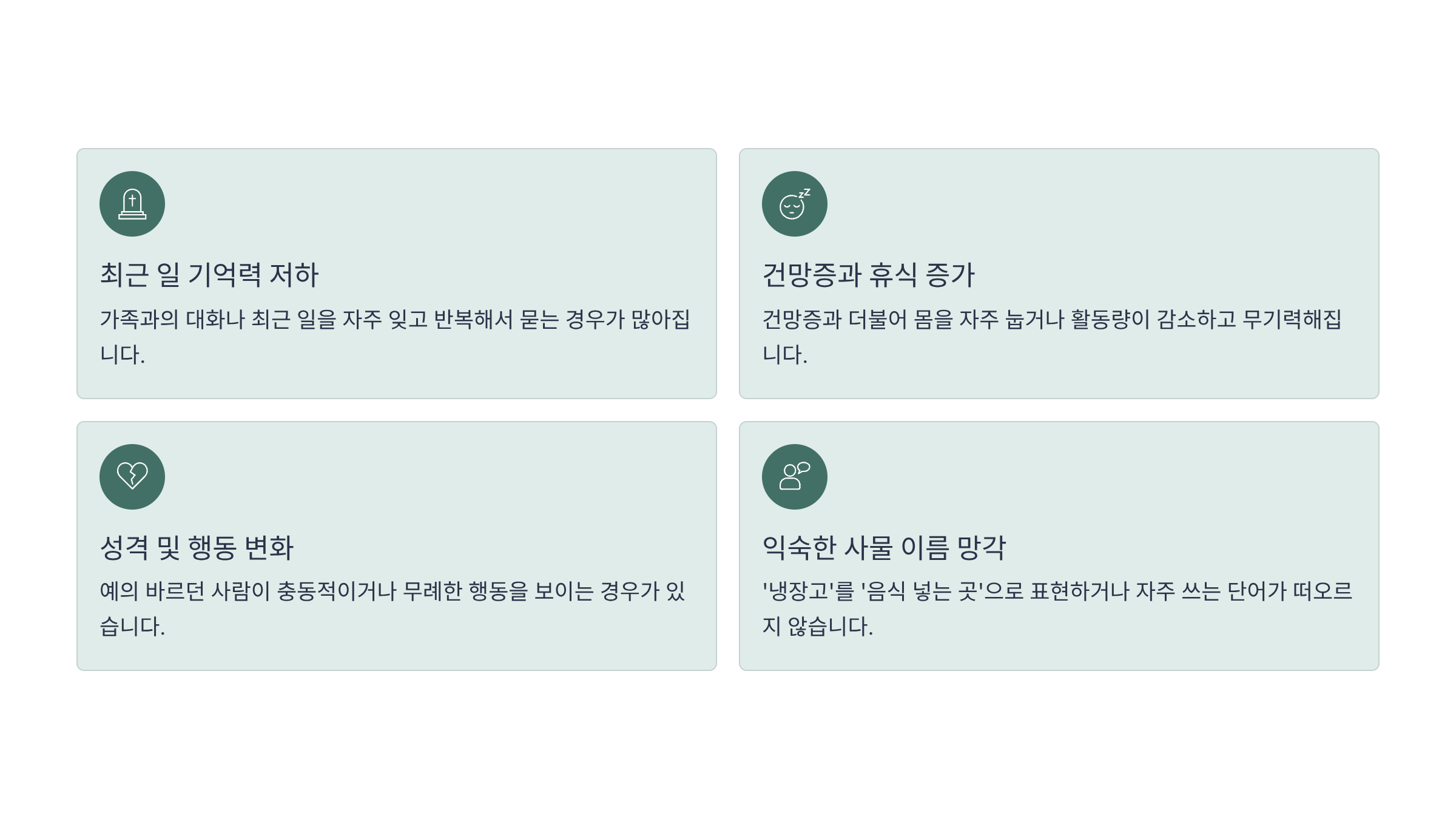 치매의 초기증상은 다양한 형태로 나타나며, 증상을 잘 알아두면 조기 발견과 치료에 큰 도움이 됩니다. 대표적 증상 8가지를 구체적인 사례와 함께 설명합니다.