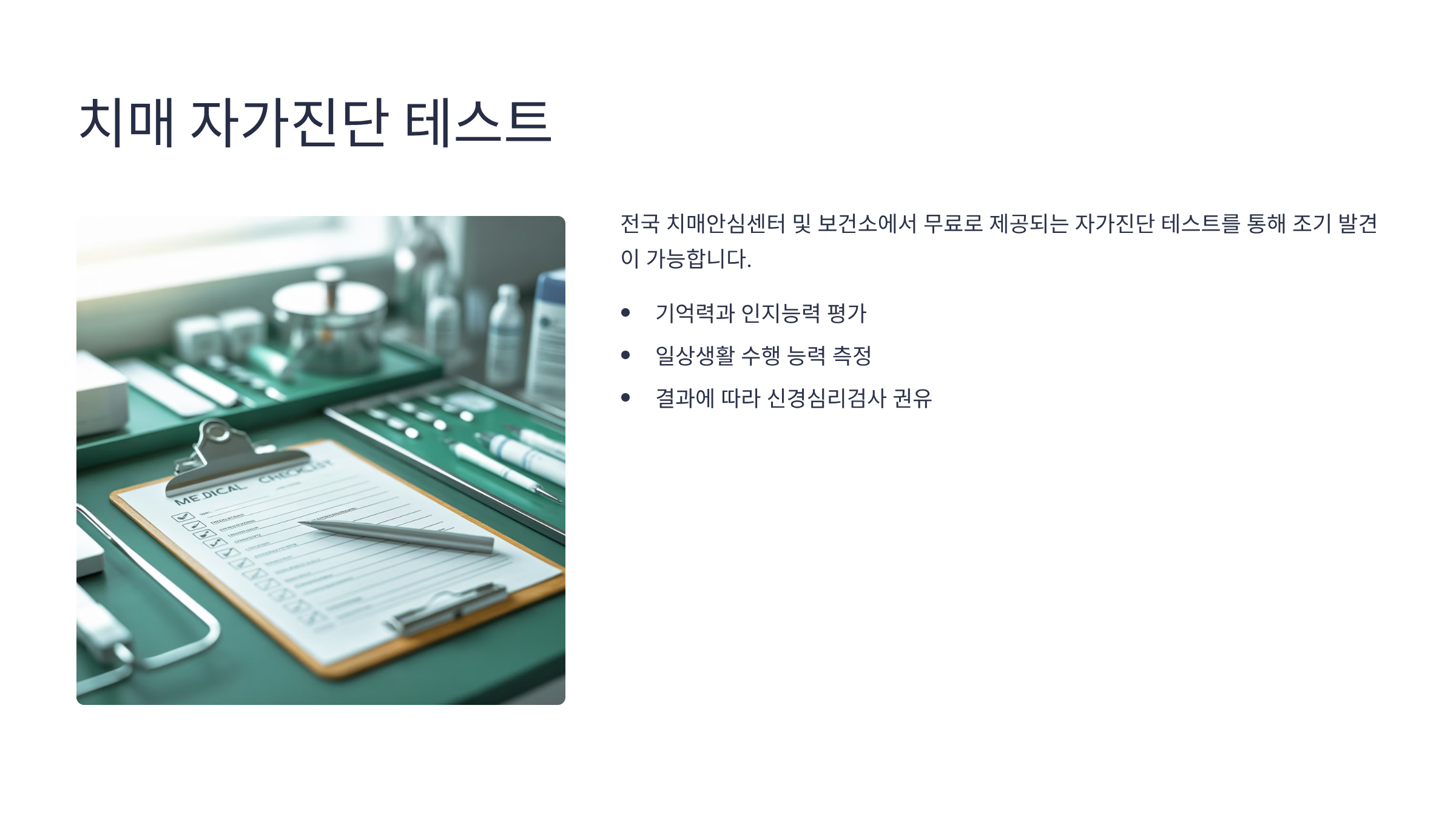 가족이나 본인이 쉽게 할 수 있는 자가진단 테스트는 전국 치매안심센터 및 보건소에서 무료로 제공됩니다. 기억력과 인지능력, 일상생활 수행 능력을 평가하며, 결과에 따라 신경심리검사를 권유받습니다. 이를 통해 조기 발견이 가능하며 적절한 치료와 관리에 도움을 줍니다.