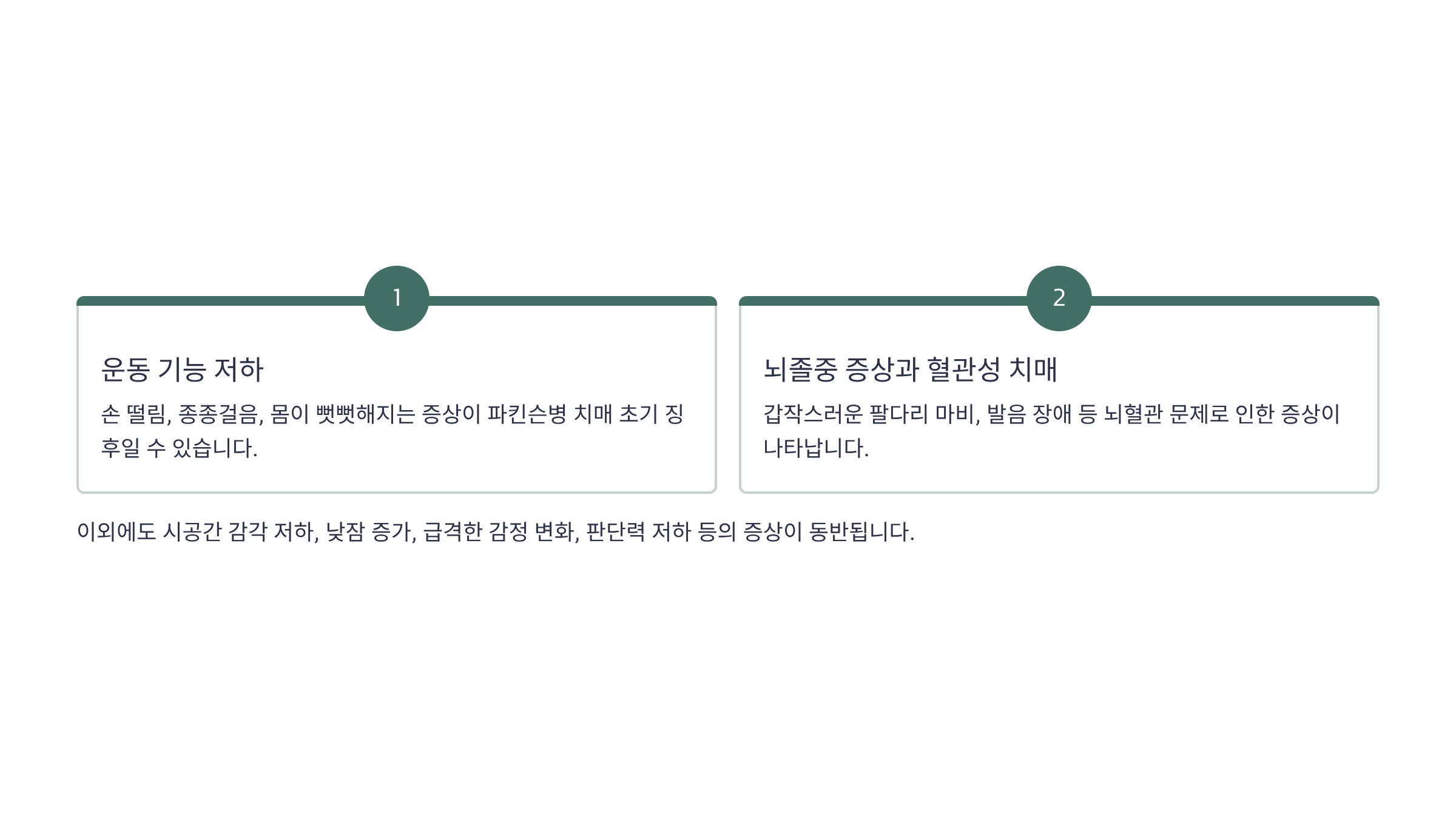 손 떨림, 종종걸음, 몸이 뻣뻣해지는 증상이 파킨슨병 치매 초기 징후일 수 있으며, 움직임이 느려지고 균형 감각이 떨어집니다. - 뇌졸중 증상과 혈관성 치매