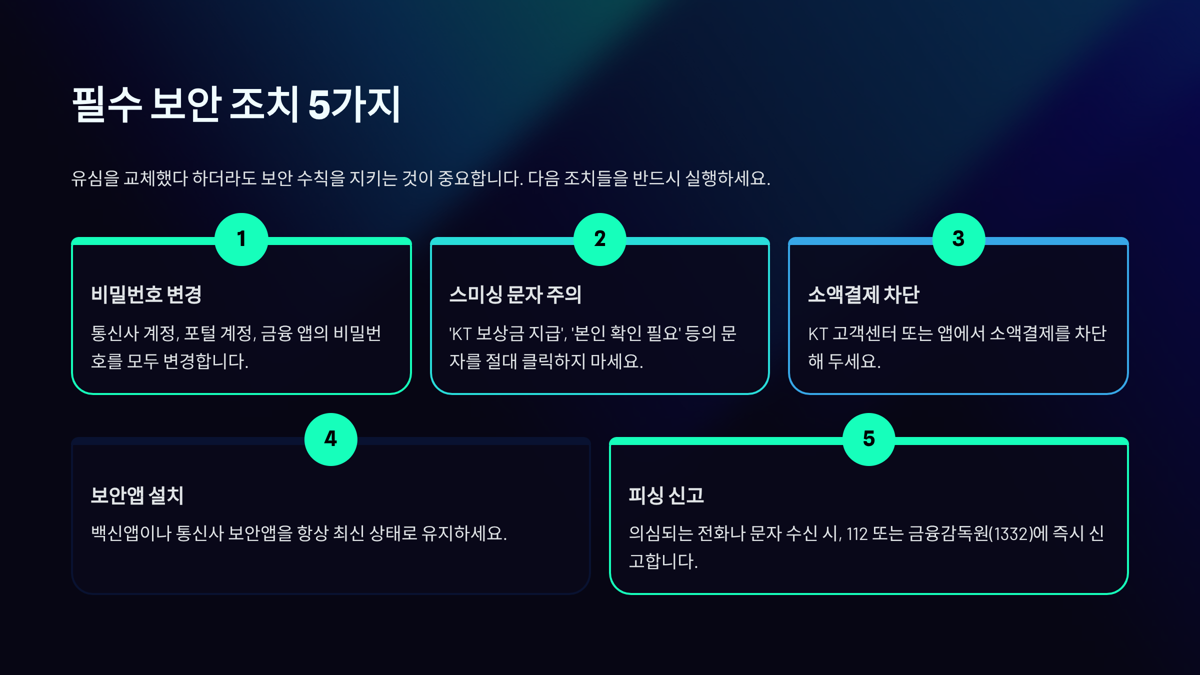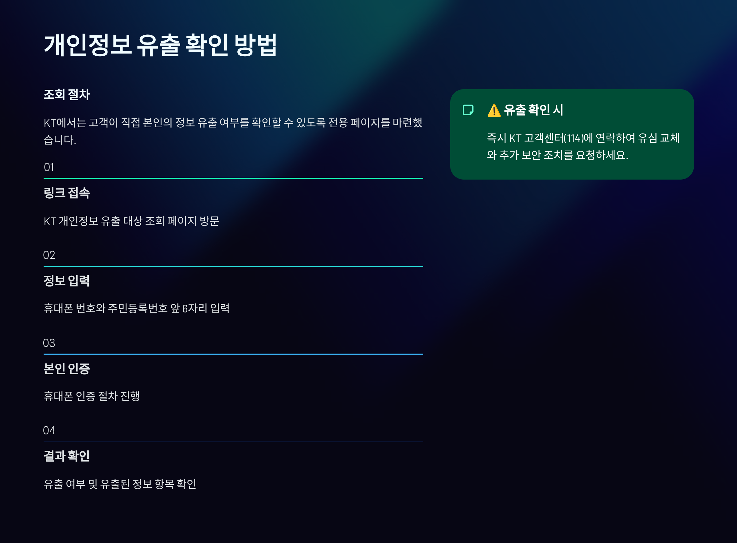 ⚠️ 유출이 확인된 경우, 즉시 KT 고객센터(114)에 연락하여 유심 교체와 추가 보안 조치를 요청하세요.