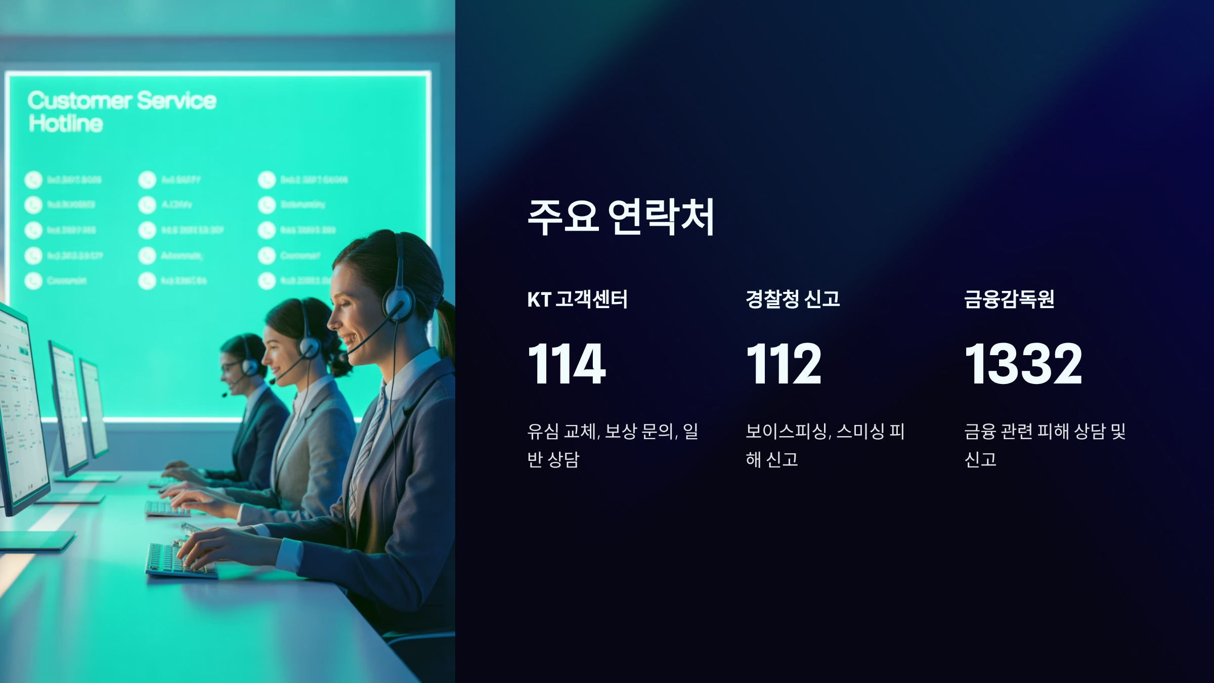 - 피싱 신고: 의심되는 전화나 문자 수신 시, 112 또는 금융감독원(1332)에 즉시 신고합니다.