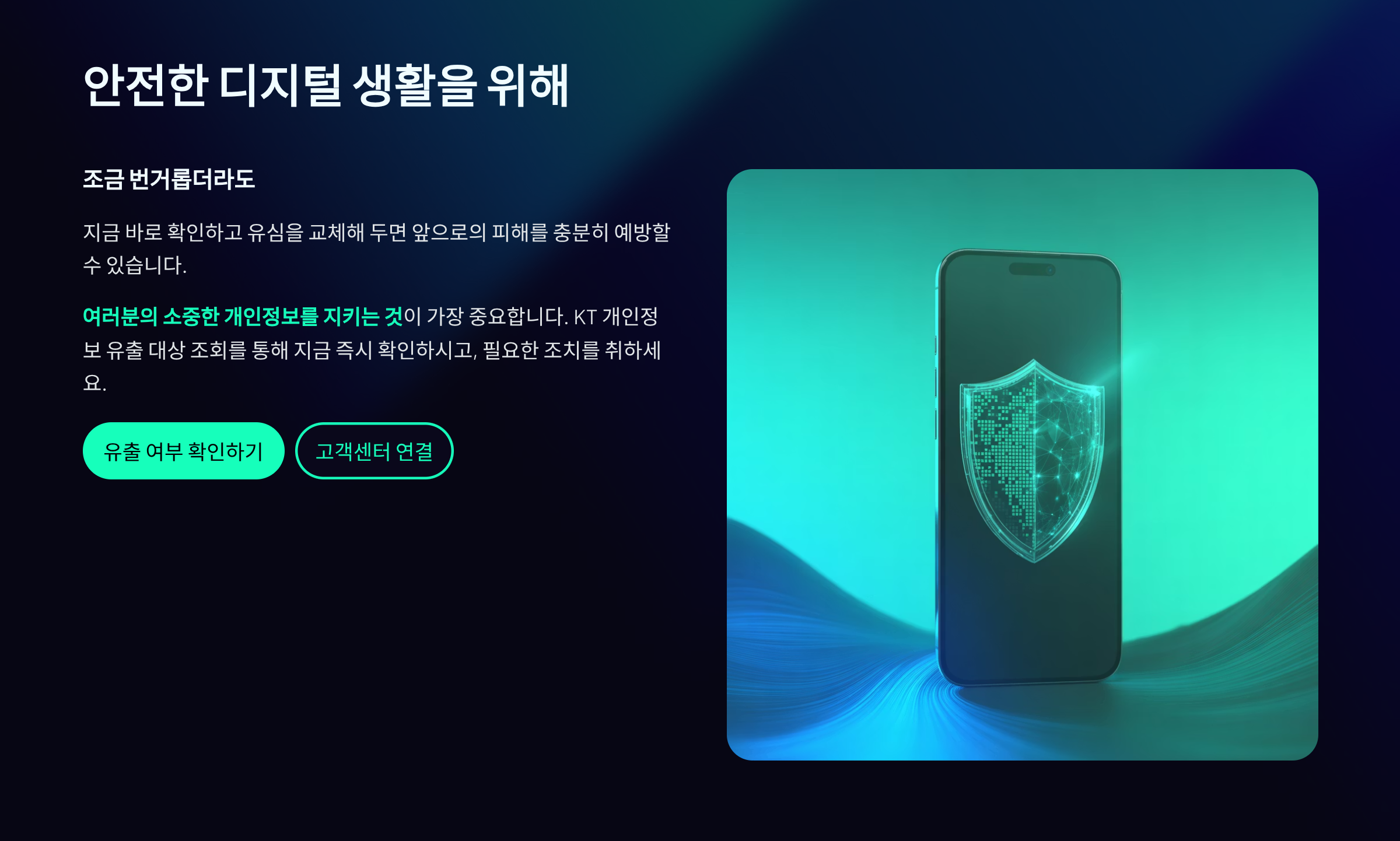 KT는 즉시 보안 점검에 나섰지만, 그 과정에서 일부 이용자들의 개인정보(이름, 전화번호, 생년월일 등) 가 외부로 유출된 사실이 밝혀졌습니다.