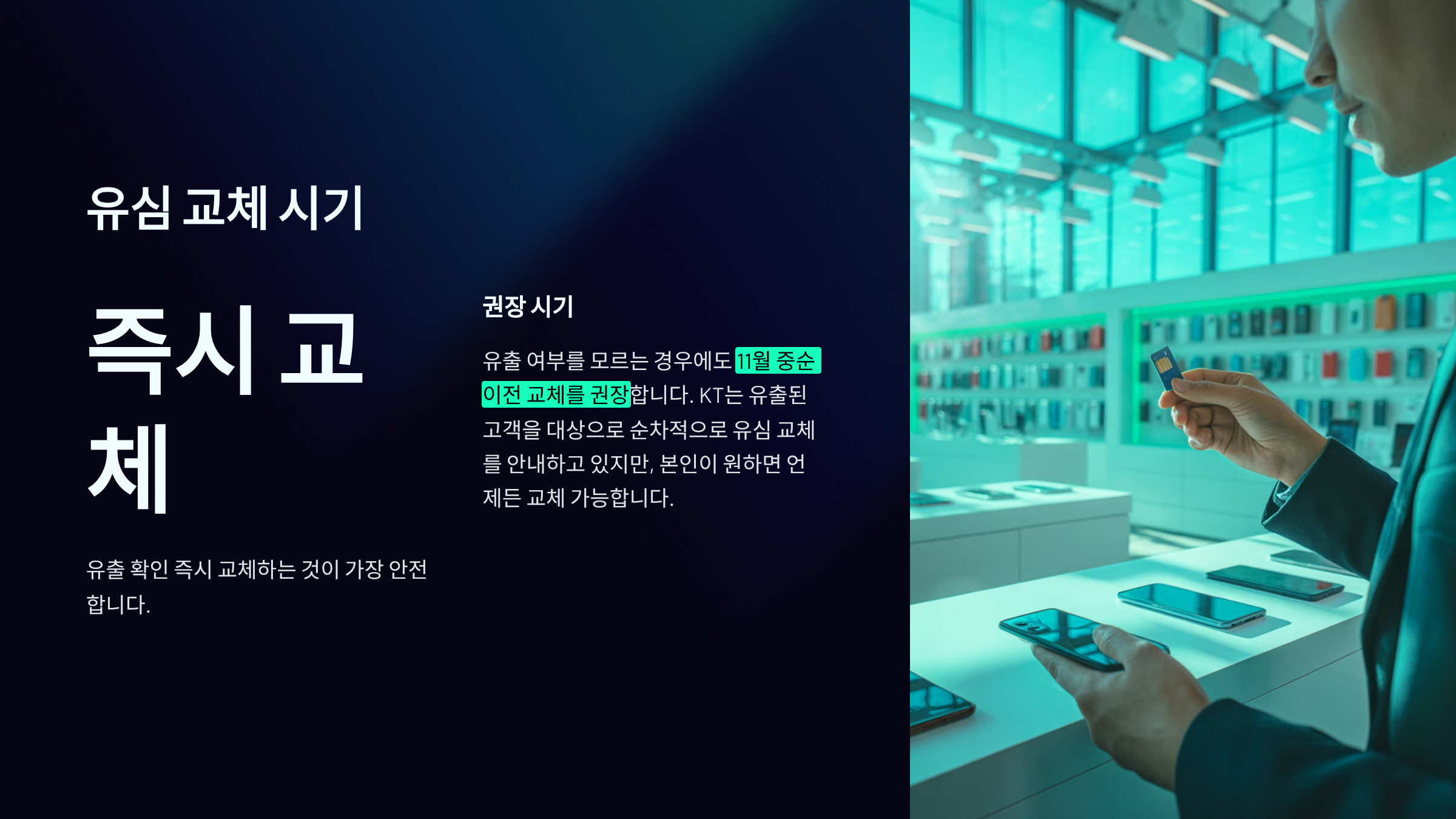 | 유심 교체 | 가까운 KT 대리점 방문 | 신분증 지참, 무료 교체 가능 |
