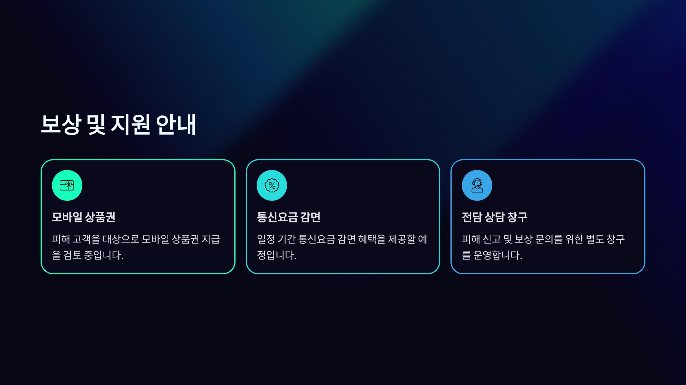 - 피해 고객에게 모바일 상품권 또는 통신요금 감면 보상을 검토 중입니다.