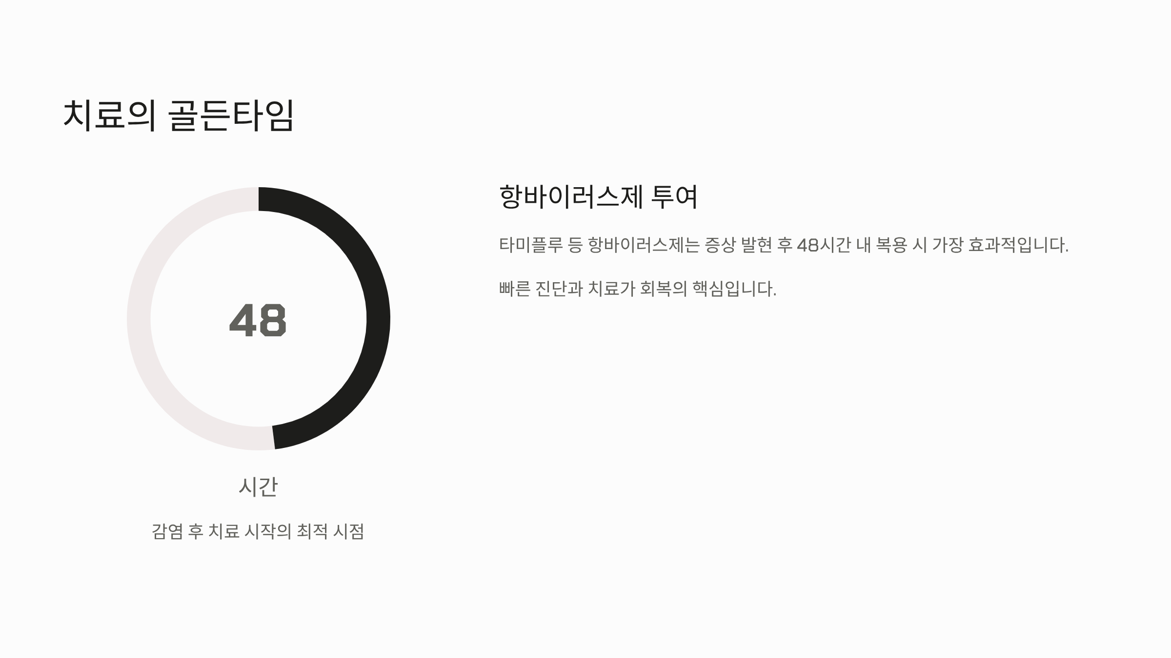 - 진단 시, 항바이러스제(타미플루 등) 투여 가능하며, 감염 후 48시간 내에 치료를 시작하는 것이 가장 효과적