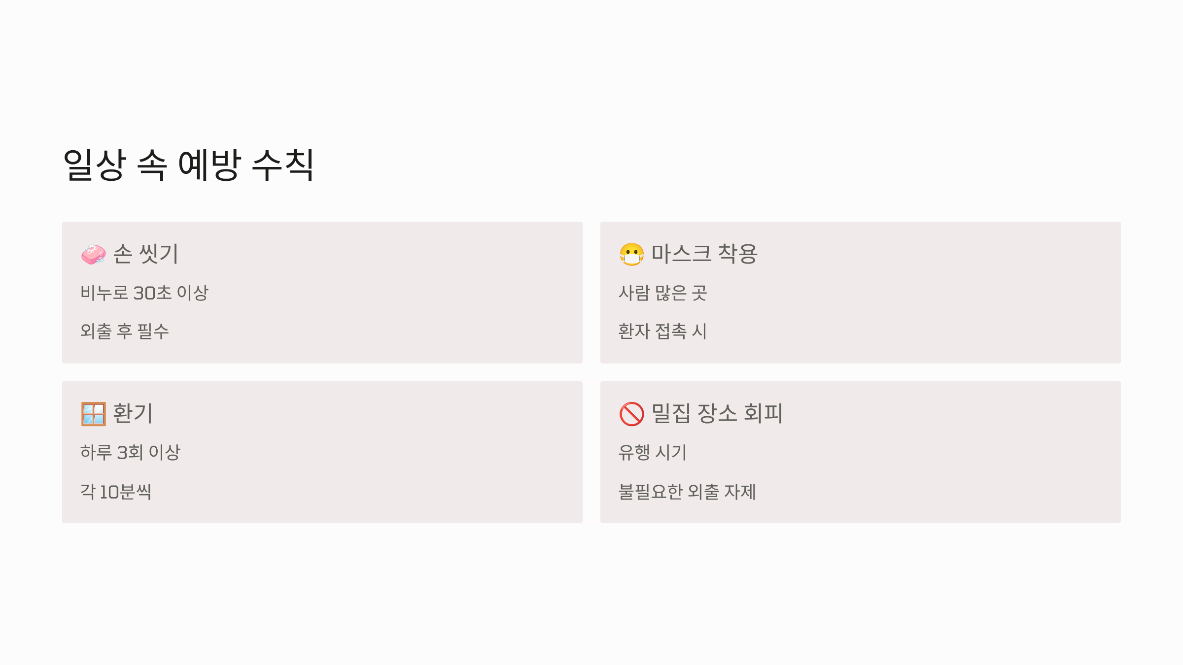 - 완치 후에도 최소 2일 이상 추가로 휴식을 권장하여 전염을 방지하고 신체 회복을 돕습니다.