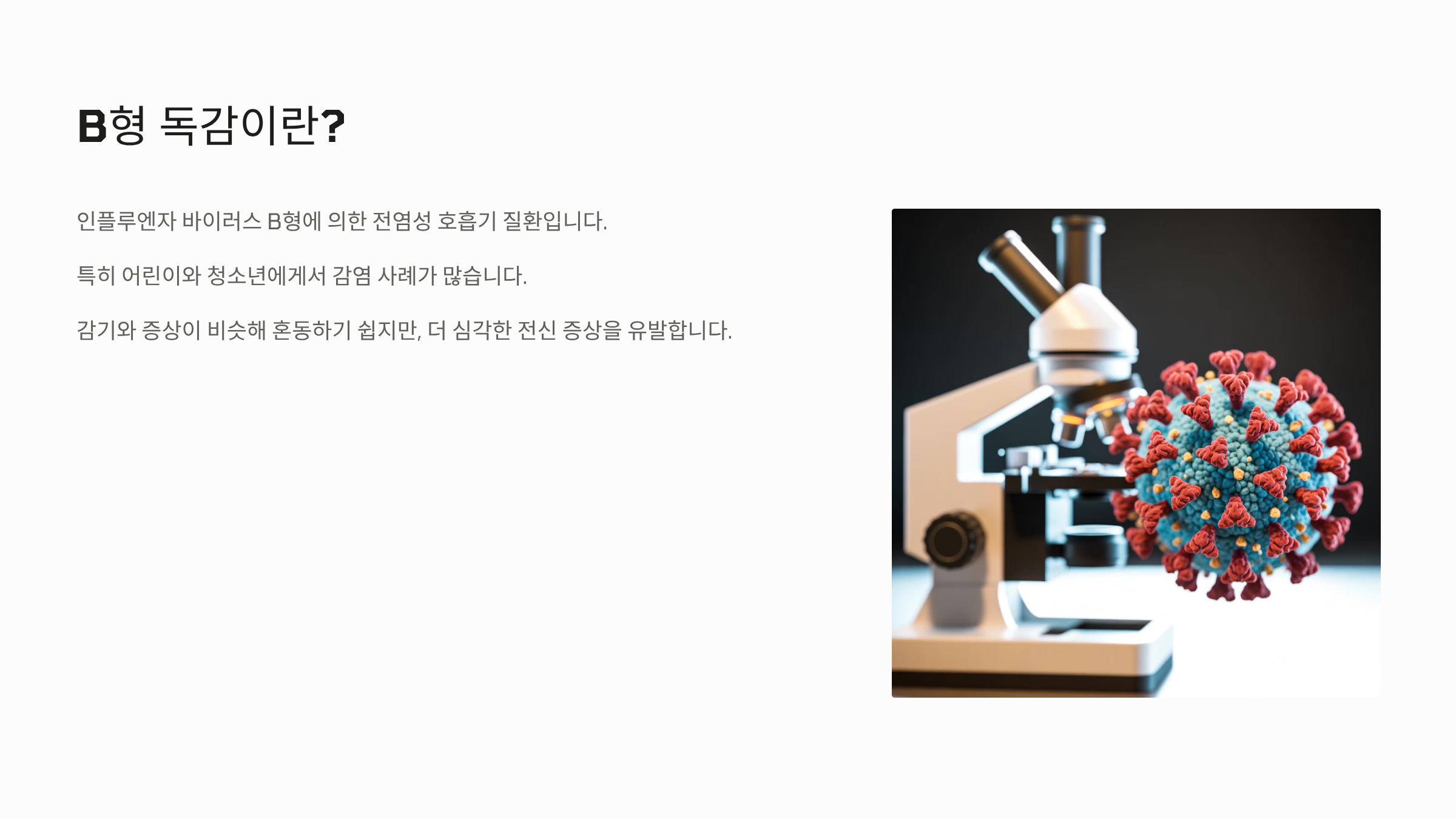 b형 독감은 인플루엔자 바이러스 B형에 의해 발생하는 전염성 호흡기 질환으로, 특히 어린이와 청소년에서 많은 감염 사례를 보이고 있습니다.