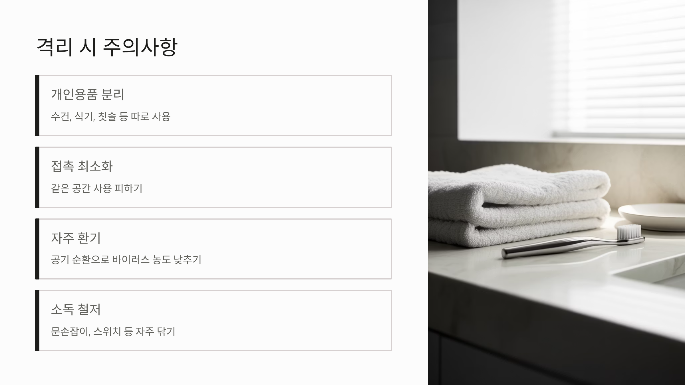 - 가족이나 동거인 중 감염자가 있을 때는 접촉 최소화하고, 개인용품 분리, 자주 환기하세요.