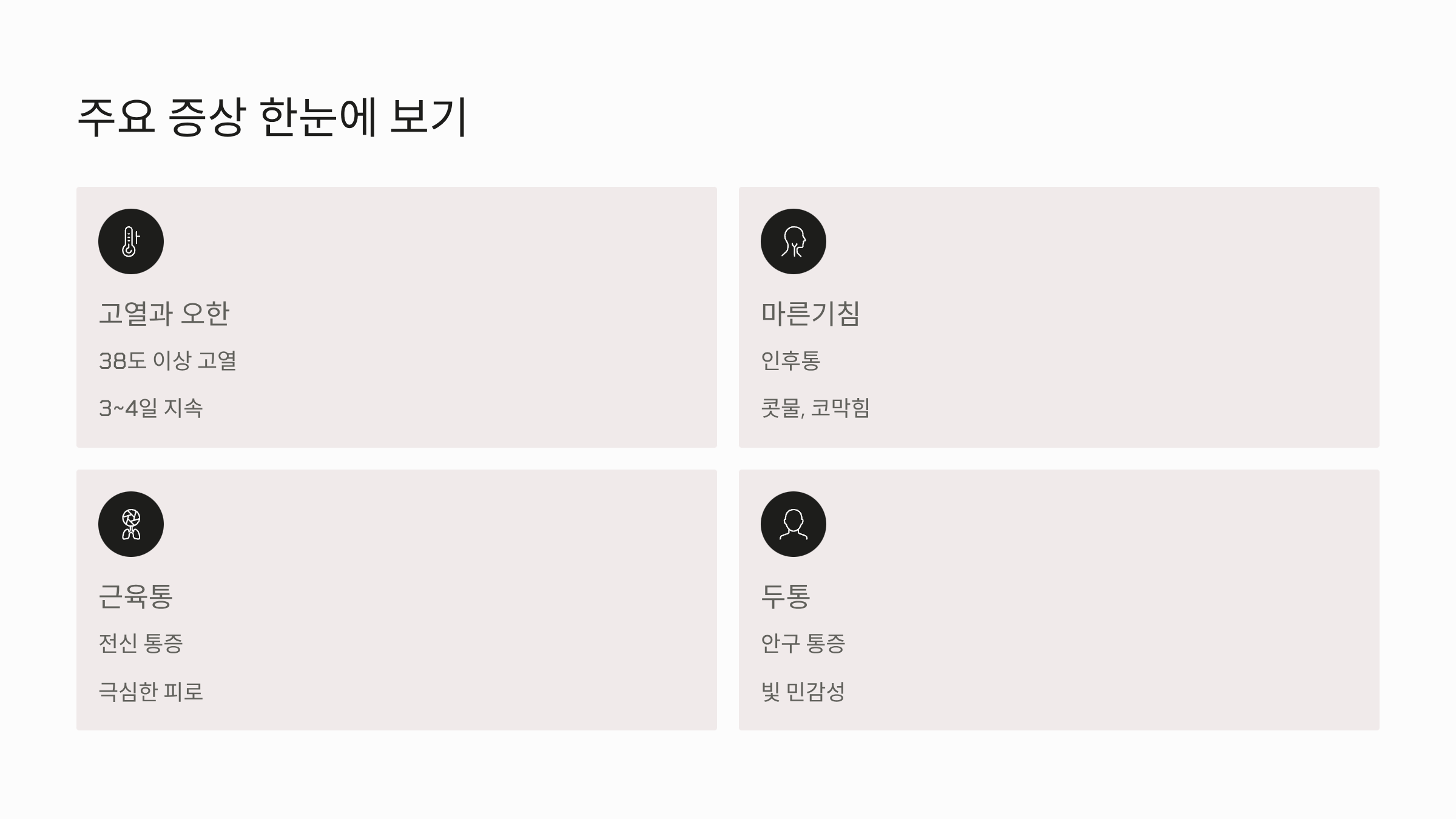 - 마른기침과 인후통: 초기에 마른기침이 심하고 목이 아프며, 콧물과 코막힘이 동반됩니다. 열이 떨어진 뒤에도 기침은 며칠 더 지속될 수 있습니다.