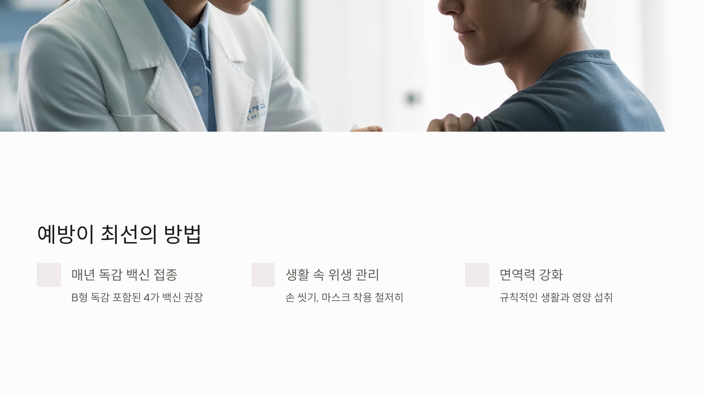- 매년 인플루엔자 백신 접종으로 예방, b형 독감도 포함된 4가 백신 접종 권장